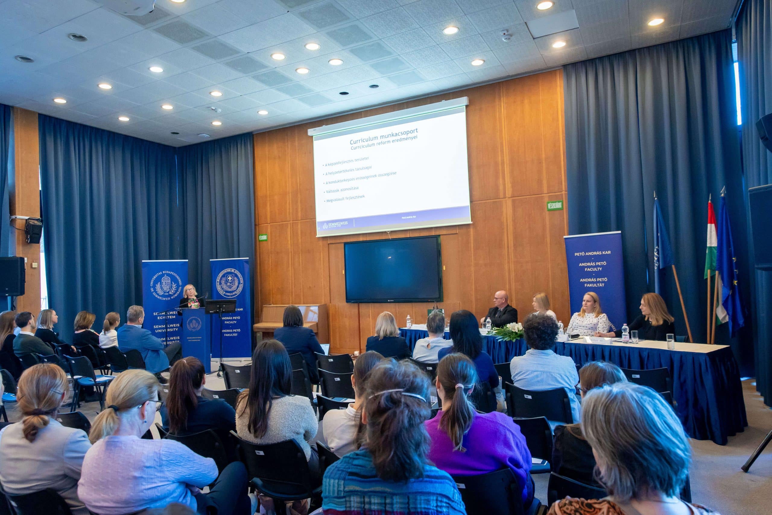 A szimpózium első szekciójában A konduktorképzés elméleti és gyakorlati innovációiról a kurrikulumfejlesztés kereteiben címmel a kurrikulumfejlesztési munkacsoport – Feketéné dr. Szabó Éva főiskolai tanár és stratégiai és fejlesztési rektorhelyettes, a Konduktív Pedagógia Központ igazgatója, dr. Matos László főiskolai tanár és oktatási dékánhelyettes, dr. Földesi Renáta főiskolai docens és a Konduktív Pedagógiai Intézet igazgatója, dr. Kállay Zsófia főiskolai adjunktus és a gyakorlati képzésért felelős dékáni megbízott, valamint dr. Túri Ibolya főiskolai tanár és tudományos dékánhelyettes – tartott beszámolót.