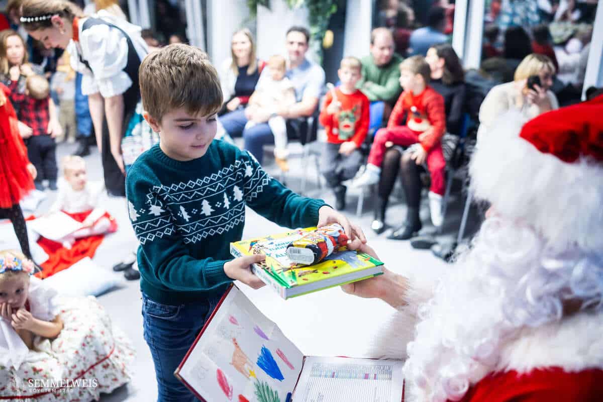 A Semmelweis Egyetem Elnök utcai Napköziotthonos Óvodájában december 5-én délelőtt járt a Mikulás. A várakozást az óvónénik mesejátéka színesítette, a Mikulás levese című mesét játszották el a gyerekeknek, majd a Mikulás megérkezésekor minden gyermekcsoport megajándékozta őt versekkel, dalokkal, amikre előre gondosan felkészültek a gyerekek – foglalta össze honlapunknak Gál Edit óvodavezető. Az ajándékcsomagok átadása után jutott még idő egy közös fényképre is a Mikulással, illetve egy kis beszélgetésre a gyerekekkel.