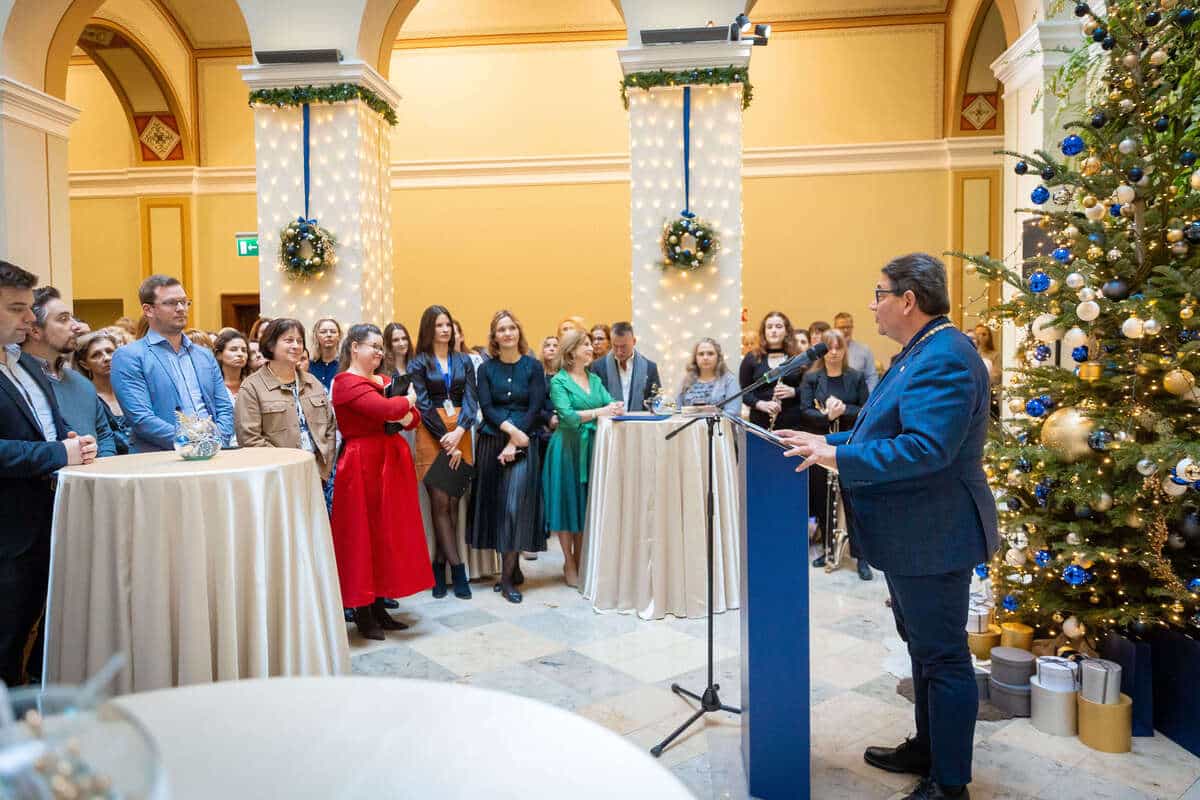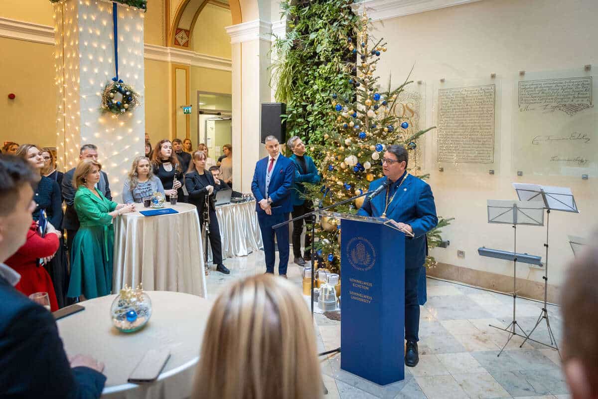 Kitért arra is, hogy az ünnepi lelassulás ideje alkalmas a számvetésre is. Szavai szerint van okunk a büszkeségre, a Semmelweis Egyetem az elmúlt évben tovább bővült és gazdagodott. „Rekordösszeget fordítottunk az infrastruktúránk fejlesztésére, és ezzel a jövő sikereinek alapjait fektettük le. A nemzetközi rangsorokban elért eredményeink visszatükrözik azt a kiválóságot, amit a Semmelweis Egyetem polgárai nap mint nap tanúsítanak munkájuk során. Ez az emberi erőforrás legfőbb kincsünk, egyetemünk legnagyobb értéke” – hangsúlyozta beszédében dr. Merkely Béla.