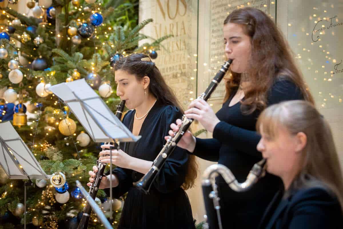 A Karácsonyi teán a Medikus Zenekar Mozart egyik triójának két tételét, valamint karácsonyi dalokat, a Semmelweis Egyetem Kórus kamarakórusa Irving Berlin White Christmas és Wolfgang Kelber Glorious Kingdom című darabját adta elő.