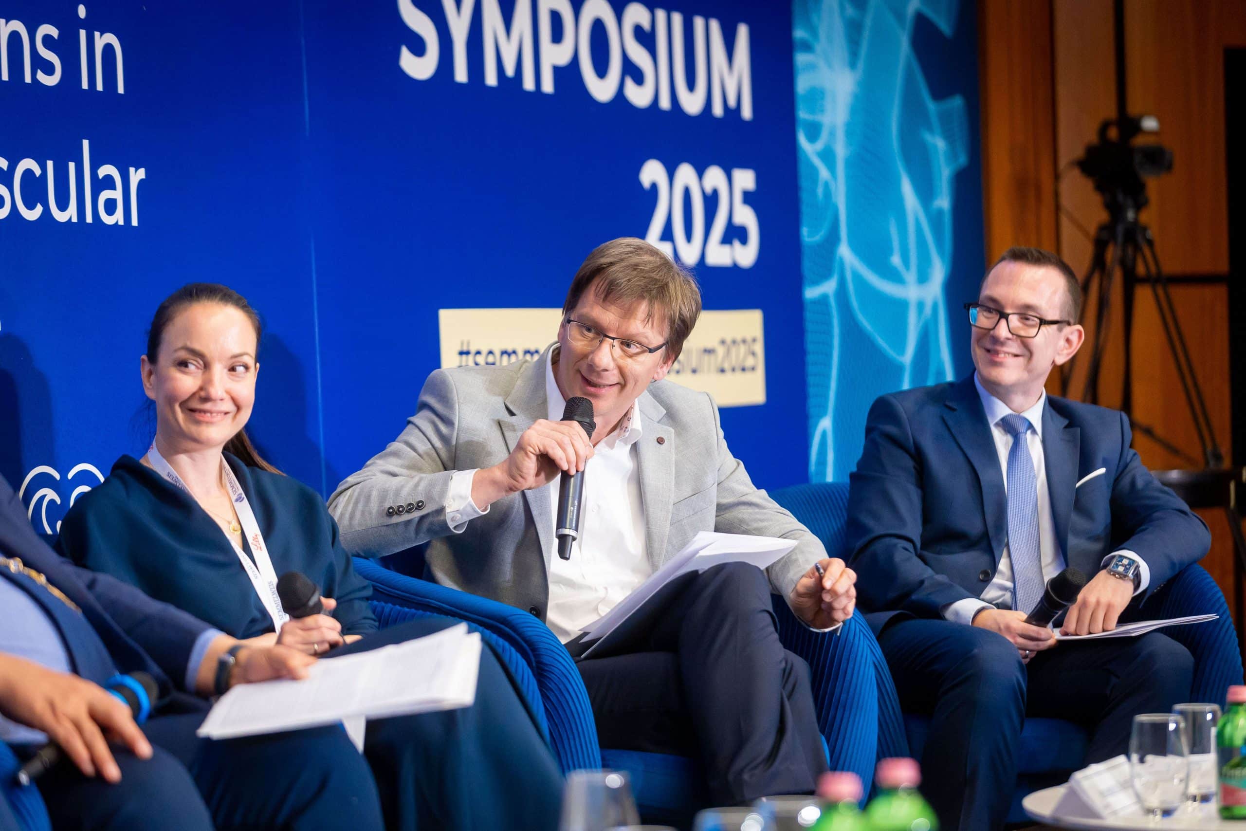 A szimpózium keretében lehetőségünk nyílt az Európai Kardiológiai Társaság (ESC) közép- és kelet-európai tagállami képviselőinek meghívására egy közös szekciót tartani, melynek kifejezett célja volt a tagországok együttműködése által javítani a klinikai ellátást, és lehetőséget teremteni további közös vizsgálatok inicializálására. A kerekasztal-beszélgetésen neves kardiológus professzorok vettek részt dr. Cecilia Linde professzorral, az ESC megválasztott elnökével együtt, akik bemutatták a jelenleg futó és a tervezett klinikai vizsgálatokat. Kiemelt figyelmet kaptak a távmonitorozással kapcsolatos kihívások, különösen az elérhetőség és finanszírozás kérdései. Emellett bemutatták a nemzeti regisztereket is, amelyek bővítéséről és harmonizációjáról is egyeztettek a résztvevők régiók szintjén. A kerekasztal során ismertették a dr. Merkely Béla (Semmelweis Egyetem, Városmajori Szív- és Érgyógyászati Klinika) által kezdeményezett, folyamatban lévő Budapest CRT-TAVI prospektív, randomizált vizsgálatot is, amelynek célja a CRT hatásának vizsgálata TAVI implantáción átesett betegekben, akik a beavatkozást követően kialakuló és perzisztáló bal Tawara-szárblokkal, valamint mérsékelten csökkent balkamra-funkcióval rendelkeznek.