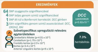 Teljes genomot átfogó elemzés (GWAS) során több mint 6,076,829 variánst elemeztünk. A legerősebb összefüggést a DCC gén egyik variánsa esetében azonosítottuk, de más génekben is találtunk teljes genom szinten szignifikáns variánsokat. A stressz nélkül megjelenő depressziós tünetekkel összefüggő gének szingifikáns upregulációt mutatnak számos, depresszió szempontjából fontos agyterületen, a frontális és anterior cinguláris kortexben. Az eredmények szerint a stressztől függetlenül megjelenő depresszió molekuláris örökletessége 7.3%. A kutatás segít elkülöníteni a depresszió altípusait, ami közelebb visz a személyre szabott diagnózishoz és kezeléshez. A tanulmány hangsúlyozza: a genetika és környezet szétválasztása csökkenti a „zajt” a kutatásokban, jobb terápiákat ígérve – fogalmazott dr. Gonda Xénia.