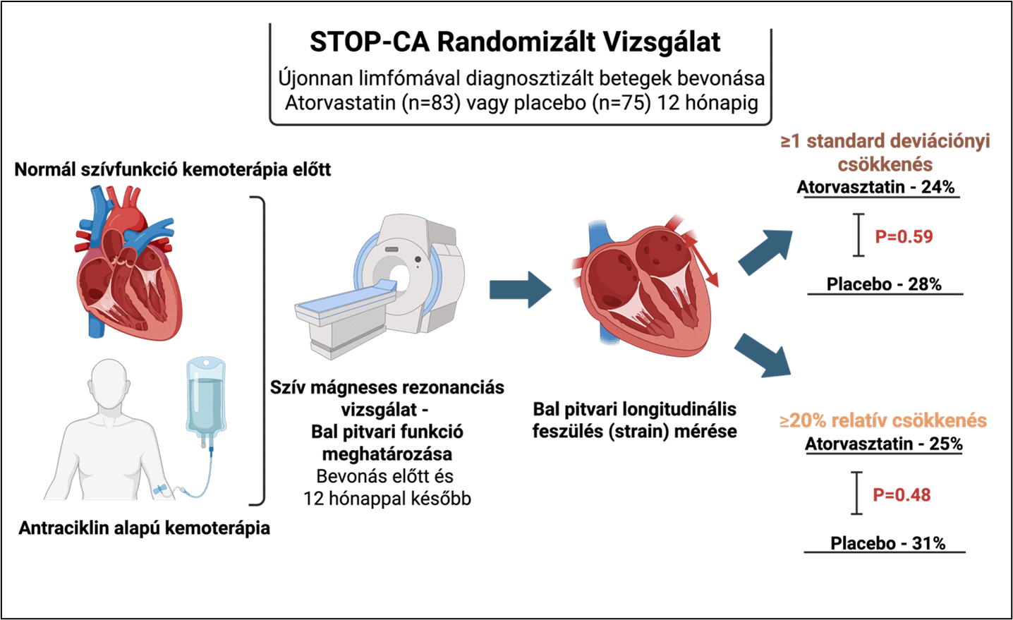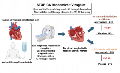 A kutatásban résztvevő betegeket véletlenszerűen két egyenlő csoportra osztottak: az egyik atorvasztatint kapott, a másik placebót (hatóanyag nélküli tablettát). A STOP-CA vizsgálat elsődleges eredményei a szív bal kamrája funkciót védő hatást igazoltak az atorvasztatint kapó csoportnál. A szív bal pitvarára gyakorolt hatásokat azonban eddig nem vizsgálták. A kemoterápia kezdete előtt és 12 hónap után szív mágneses rezonanciás (CMR) felvételeket készültek, a bal pitvari funkció, benne a longitudinális falfeszülés mérésével, meghatározása céljából. Az eredmények alapján az antraciklin-kezelés után mindkét csoportban mérsékelten romlott a bal pitvar működése, de az atorvasztatin nem nyújtott védelmet ez ellen. A bal pitvari funkció romlása az 50 év feletti betegneknél kifejezettebb volt – írta összefoglalójában dr. Juhász Vencel.