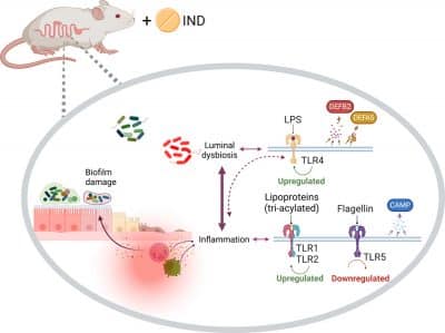A nem-szteroid gyulladáscsökkentők (NSAID-ok) krónikus használata károsíthatja a vékonybél nyálkahártyáját, és változásokat eredményezhet a bél mikrobióta összetételében (diszbiózis). Bár az NSAID-ok által kiváltott diszbiózis régóta ismert és bizonyítottan hozzájárul a bélkárosodás (enteropátia) kialakulásához, a gazdaszervezet és a vékonybél-baktériumok közötti kölcsönhatások változásai enteropátiában jelenleg nagyrészt feltáratlanok. Publikációnkban indomethacinnal (IND) kiváltott enteropátiában vizsgáltuk hat Toll-like receptor (TLR) és három antimikrobiális peptid (AMP) expressziójának kapcsolatát a gyulladással és a diszbiózissal, valamint a vékonybél nyálkahártyáján található bakteriális biofilm szerkezeti változásaival patkányokban.