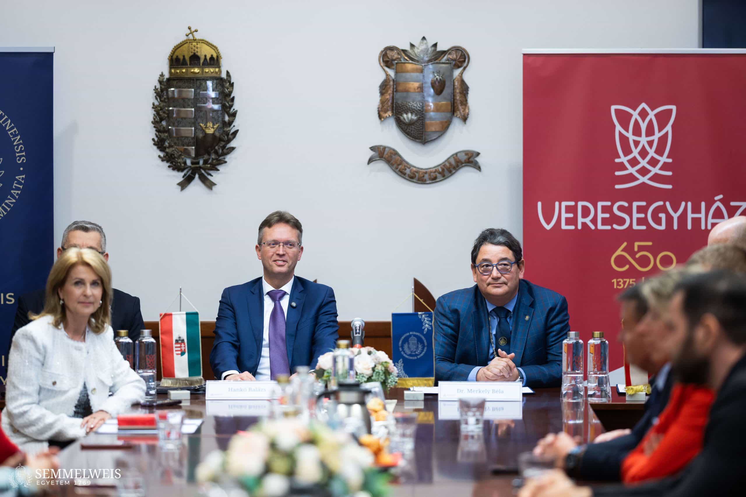 A veresegyházi városháza dísztermében megrendezett aláírási ceremónia, majd az azt követő háziorvosi fórum moderátora Cserháti Ferenc polgármester volt. Elsőként dr. Hankó Balázs kultúráért és innovációért felelős miniszter köszöntötte a vendégeket. Mint elmondta, a mai napon egy 650 éves város és egy több mint 250 éves intézmény köt egymással megállapodást. „Nem másért, mint hogy a veresiek és a Veresegyház környékén élők még egészségesebben, még tovább és még jobb életminőségben tudjanak élni” – magyarázta, hozzátéve, hogy a város úgy ünnepelte a tavalyi kerek évfordulóját, hogy csatlakozott a WHO Egészséges Város kezdeményezéséhez. Ebben nyújt számára segítséget a Semmelweis Egyetem, melynek a megállapodással nemcsak nemzetközi és országos elismertsége, de a helyi közösségben betöltött szerepvállalása is erősödik. A miniszter kiemelte, hogy a tavalyi évben az egyetemhez csatlakozott a Gödöllői Semmelweis Egészségközpont, ezzel pedig megújul a szakrendelő, növekedett a szakorvosi órák száma, az ellátás minősége és számos új eszköz beszerzése és az egészségügyi ellátásba történő integrációja is megvalósult.