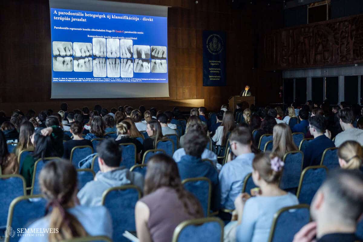 „Amikor én kezdtem az egyetemet, akkor főként a fogatlan állcsontok helyreállításáról beszéltünk kivehető fogpótlásokkal, napjainkban pedig szinte minden páciens fix pótlást kér, még akkor is, ha elfogyott az állcsontja – és ezt meg is tudjuk csinálni” – érzékeltette a tudomány előrehaladását köszöntőjében dr. Gerber Gábor, a Fogorvostudományi Kar dékánja. Hozzátette, hogy a kurrikulumban szereplő implantológia, parodontológia és fogpótlástan ismereteknek a képzést követően olyan funkcionális egységgé kell összeállnia, amellyel a későbbiekben a fogorvos el tudja dönteni, hogy adott beteg számára a kockázatokat is figyelembe véve milyen kezelést ajánljon. Felhívta a figyelmet arra is, hogy hosszú évek gyakorlata szükséges ahhoz, hogy azokat a sebészi eljárásokat, amelyekről a konferencián hallanak majd, el tudják végezni a betegeiken.