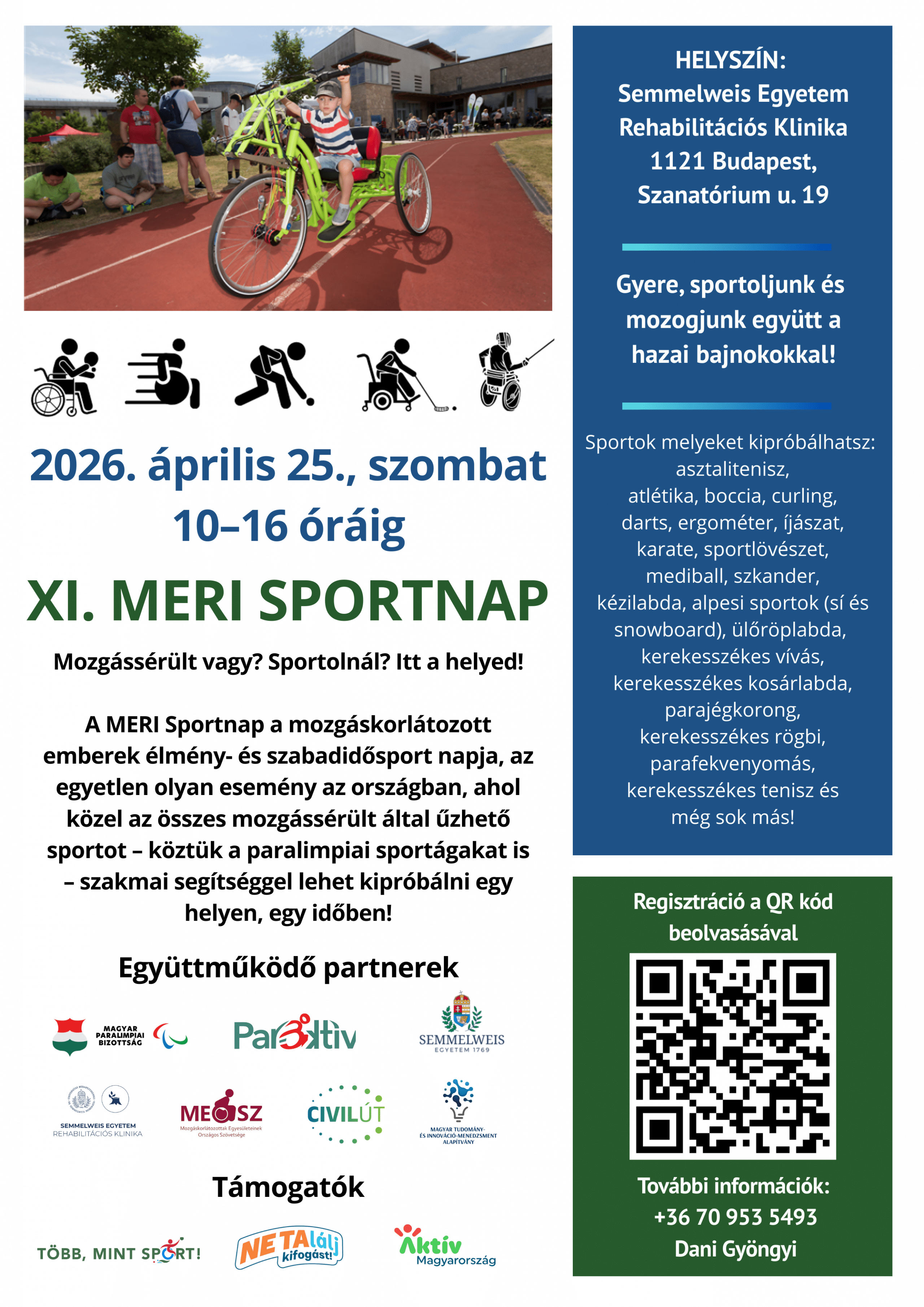 Rehabilitációs Klinika", "startDate":"2026-04-25", "endDate":"2026-04-25", "startTime":"10:00", "endTime":"16:00", "location":"1121 Budapest,, Szanatórium u. 19.", "options":["Apple","Google","iCal","Microsoft365", "MicrosoftTeams", "Outlook.com"], "timeZone":"Europe/Budapest", "iCalFileName":"XI. MERI Sportnap", "label":"Naptárba"}