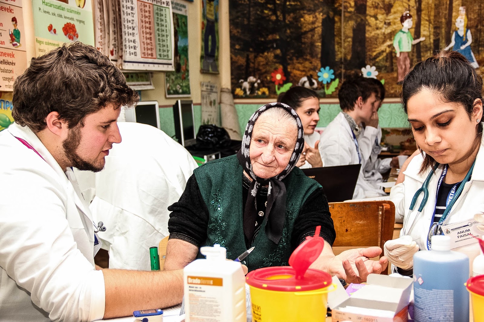 Egy rohanó buszos ebéd után továbbutazunk Péterfalvára. Úgy tervezzük, itt gyorsan végzünk majd, mert alig tíz ember jött el. A szervezők mondják is, hogy elég lesz minden egyetemi karról egy-két ember, akinek nincs kedve, annak nem muszáj jönni. Fél perccel később az egész busz lent várakozik fehér köpenyben, hogy kipakolja a szükséges felszerelést. Azt hiszem, itt már többről van szó, mint önkéntesség, mindenki segíteni jött. Miután a legtöbb dolog a helyére kerül az állomásokon, kiderül, hogy a kezdeti tíz emberből legalább hatszor annyi további várakozó lett, úgyhogy láblógatásra ezúttal sincs idő, neki is fogunk hamar a vércukor-, a vérnyomás- és a szaturációmérésnek. Egy nagy közös, kerek asztalnál dolgozunk együtt a spanyol párommal és a másik két hallgató párossal. A vizsgálatok közben és után élénk eszmecsere zajlik a vércukormérést megkönnyítő praktikákról, és a nemzetközi kerekasztal-beszélgetés után az is kiderül, hogy hol kell szúrni, hogy az a legkevésbé fájjon. Persze mindez mit sem ér, ha az épp sorra kerülő páciens alig egy méter magas, és anyukája ölében hevesen tiltakozik bennünket meglátva. Ekkor hiába minden mosoly és kedvesség, a tökmag átlát rajtunk és legszebb mosolyunkon, és szinte borítékolható, hogy ordítani fog. Ekkor viszont a lehető legjobb dolog, amit tehetünk, ha nagyon fürgék vagyunk. A tortúra után természetesen az ajándékról sem szabad elfeledkezni. Egy felfújt gumikesztyű, amire mosolygós fejet rajzolunk például tökéletesen megfelel a célnak…