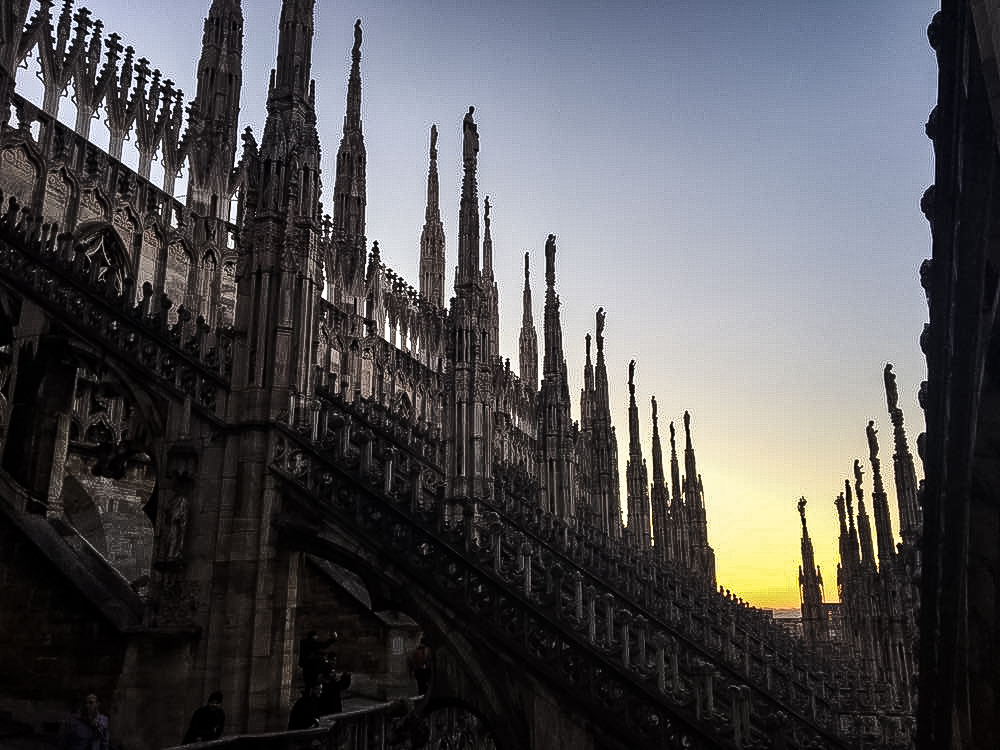 Egy művészeti kort ugorva vissza az időben, csodáljuk meg Milánó legemblematikusabb alkotását, a világ legnagyobb gótikus katedrálisát, a dómot, amely vakító fehérségével és hatalmas méretével uralja a Dóm teret, ahol, érzékenyebbek készüljenek fel, mindent ellepnek a galambok. A milánói kirándulásom nem csak szó szerinti tetőpontja volt, amikor a dóm tetején sétálgattunk, a középső és a legfelső szint látogatható. Most kicsit bajban vagyok, nem szeretnék ömlengősen írni a megkapó-letaglózó szépségéről, de a végeláthatatlan indamintás árkádok, kikukkantók, tornyocskák, csavart cukorsüvegre emlékeztető kupolácskák mesébe illőek. A dóm építése több, mint 500 évig tartott, bár a részletgazdagságát figyelembe véve még ez is kevésnek tűnik. Talán legideálisabb naplemente előtt megmászni a 150-nél is több lépcsőfokot, majd nézni, hogy vált fehérből narancssárgára a márvány a lenyugvó nap sugaraiban.