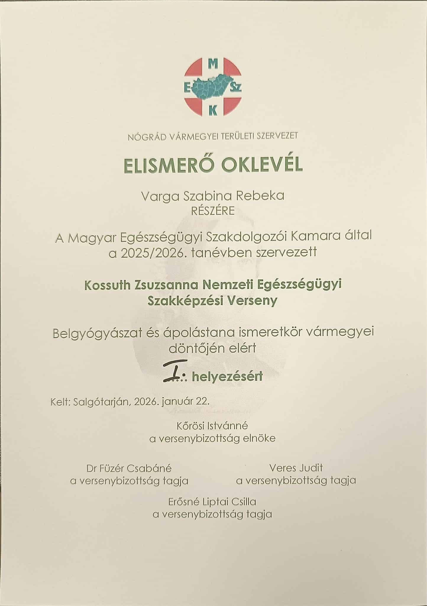 Újabb sikerekkel gazdagodott iskolánk közössége! A mai napon Salgótarjánban rendezték meg a Kossuth Zsuzsanna Nemzeti Egészségügyi Szakképzési Verseny vármegyei fordulóját, ahol diákjaink ismét bizonyították szakmai rátermettségüket.