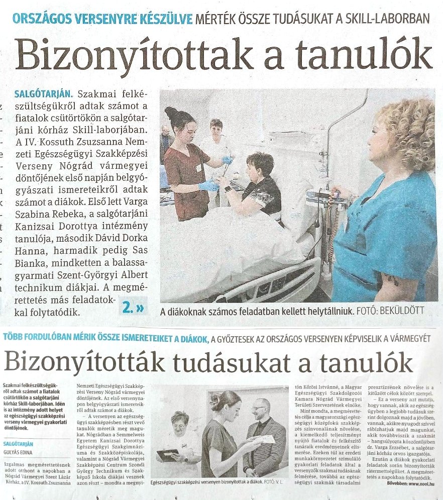 Nógrád Megyei hírlap tudósítása a Kossuth Zsuzsanna Nemzeti Egészségügyi Szakképzési Verseny megyei fordulójáról