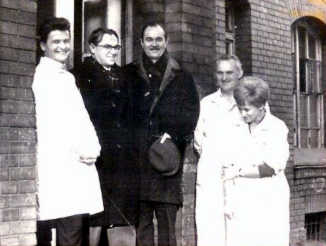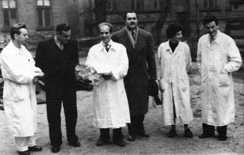 Még a Puskin utcai épület (ELTE) falai előtt: Kovách Arisztid egyetemi docens (középen), tőle jobbra Vlagyimir Mihajlovics Hajutyin professzor Moszkvából, és Monos Emil frissdiplomás gyakornok, bal felől Szilassy Gyula főasszisztens és egyik asszisztensnő munkatárs (1959)