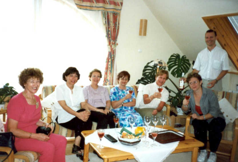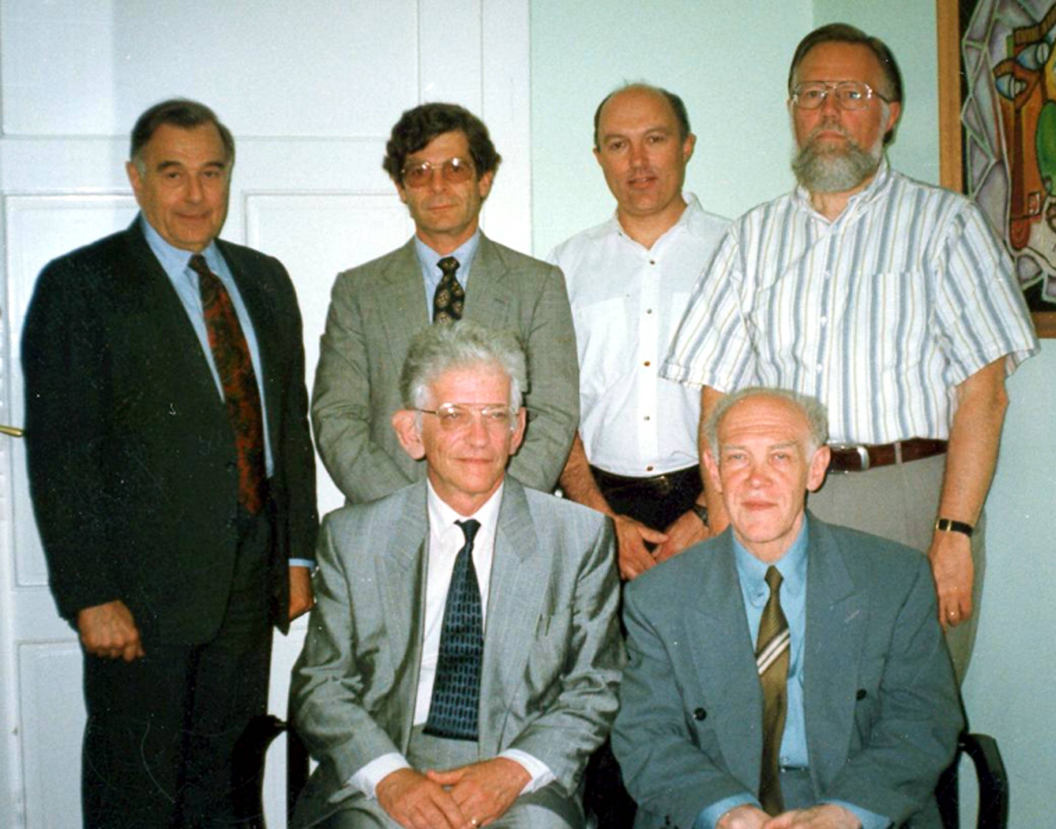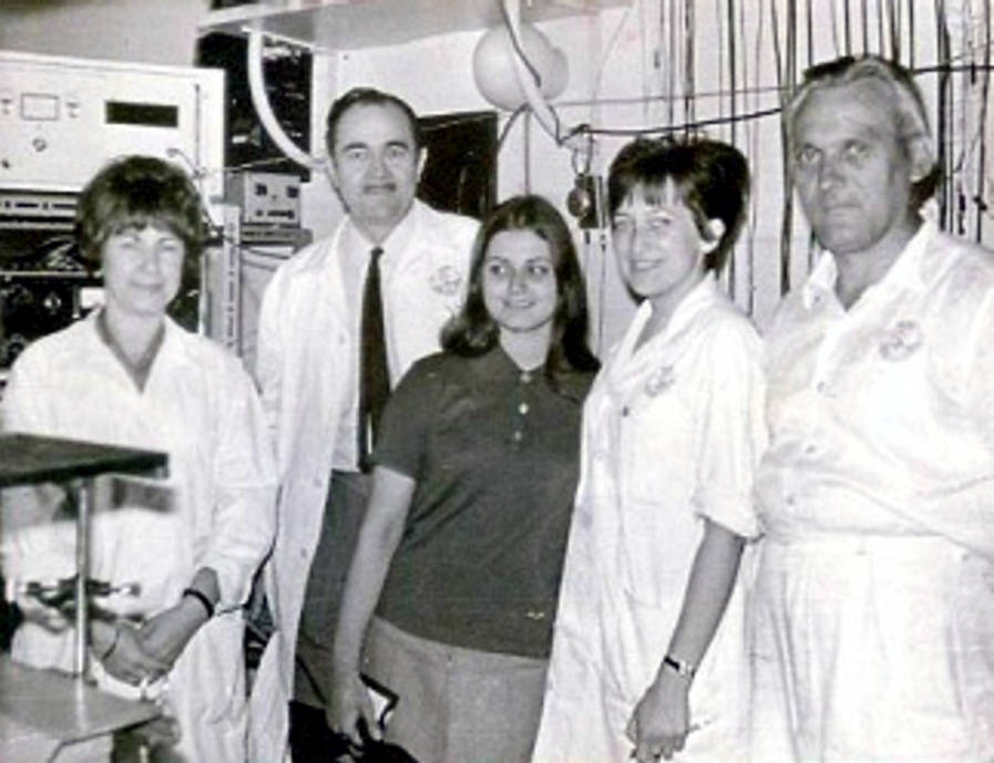 E kép is a Puskin utcában készült. Balról jobbra: Mitsányi Attila, külföldi vendég (ismeretlen), Menyhárt János, Kovách Arisztid – „a Főnök”, Kellner Mariann (kardiológus vendégkutató), Monos Emil