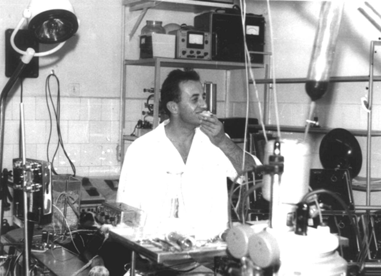 Sándor Péter kísérletezés közben a „főnöki” Saroklaboratóriumban
