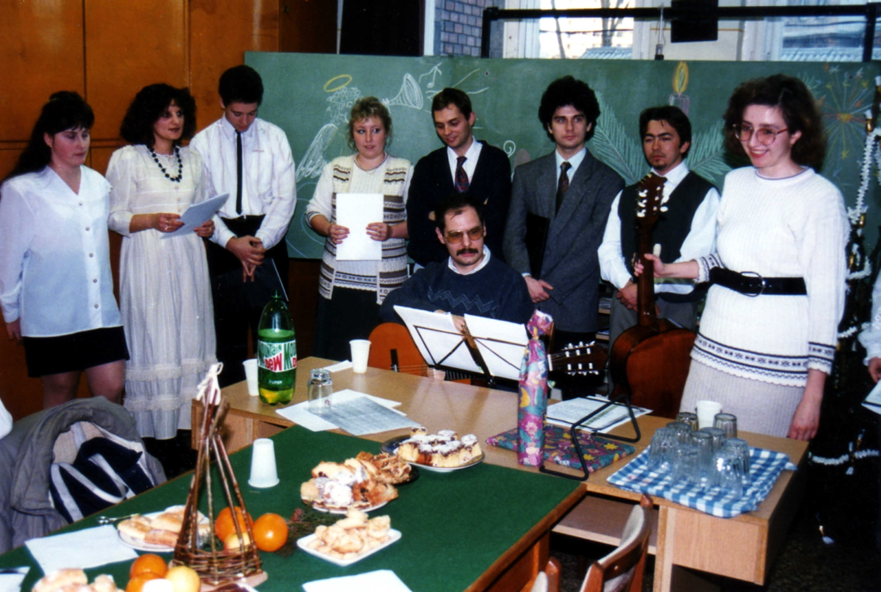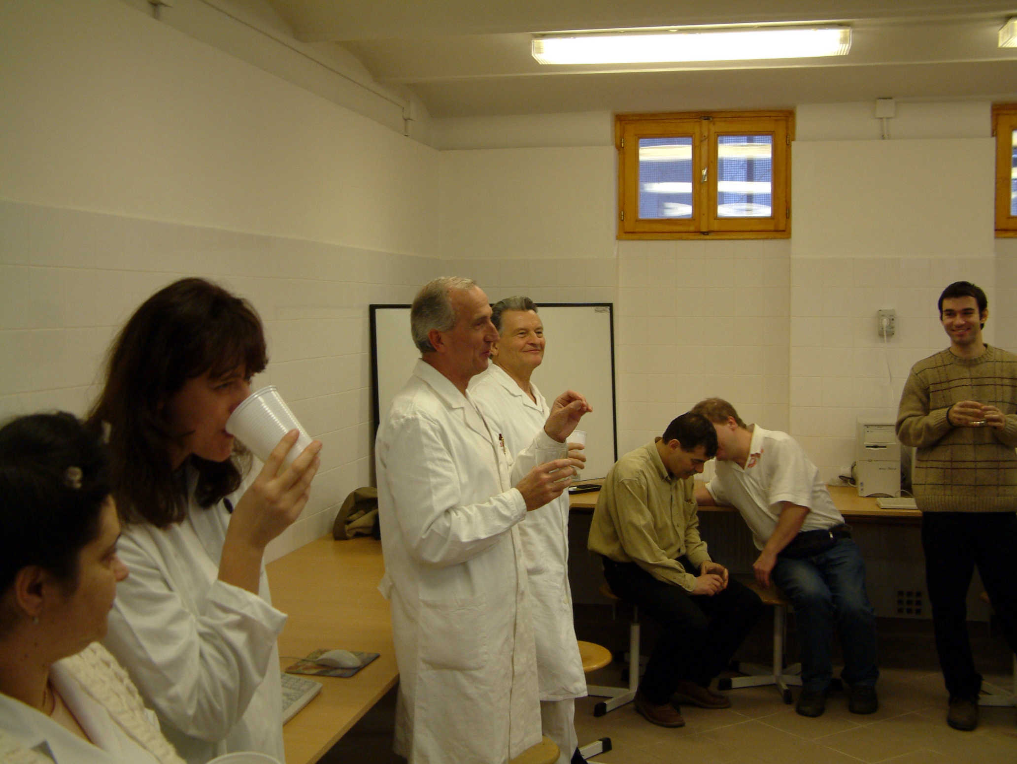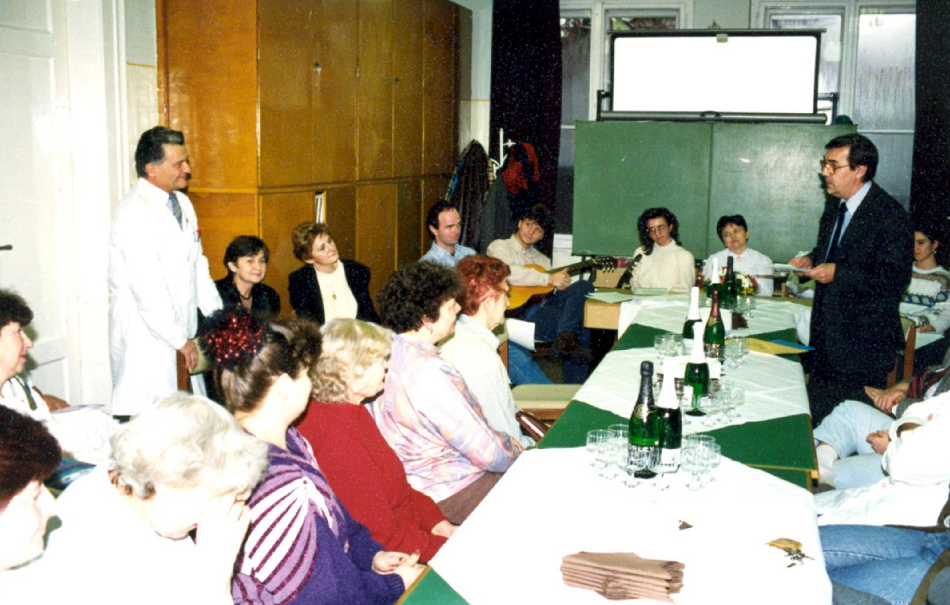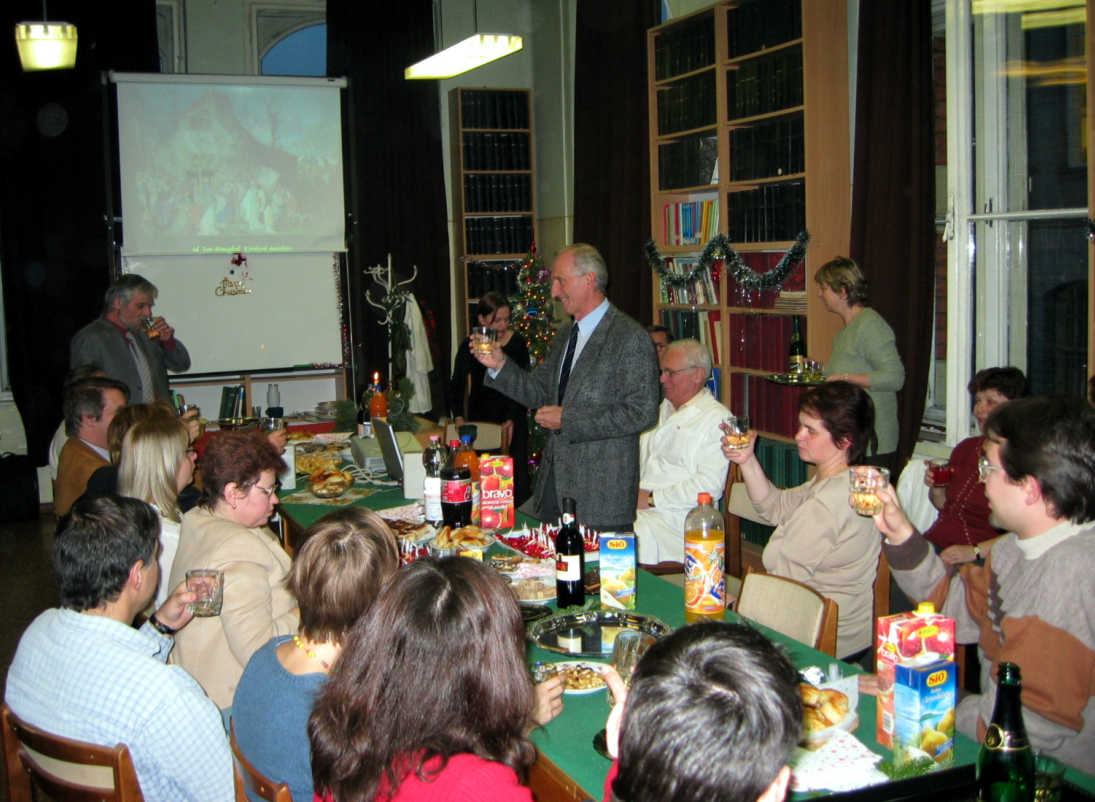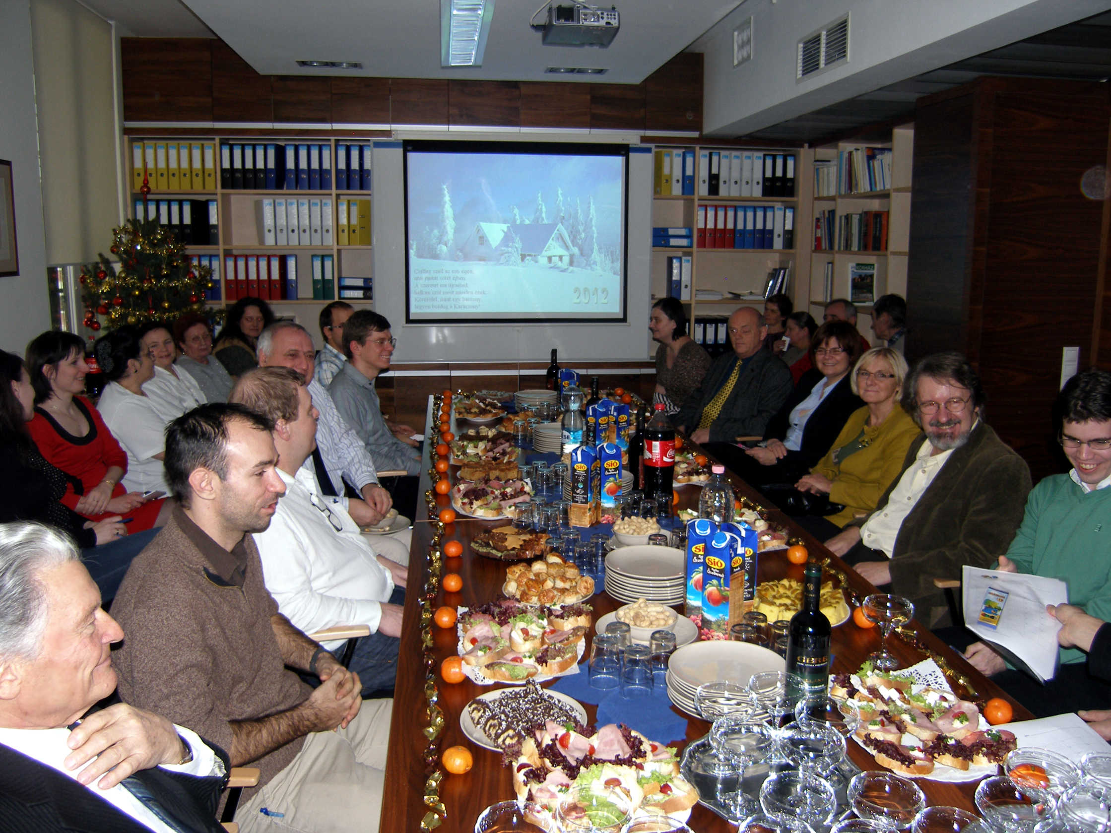 Intézetünk karácsonyi partija, gazdagon terített asztal körül, rendkívül üde és bensőséges hangulatban zajlott december 20-án. Benyó professzor lelkesen fogadott kezdeményezésére, a munkatársak kisgyermekkori fényképeiből Balog Ibolya titkárnő hangulatos, anonim vetített kitalálós versenyanyagot szerkesztett. Egy palack pezsgő volt a nyertes jutalma.
