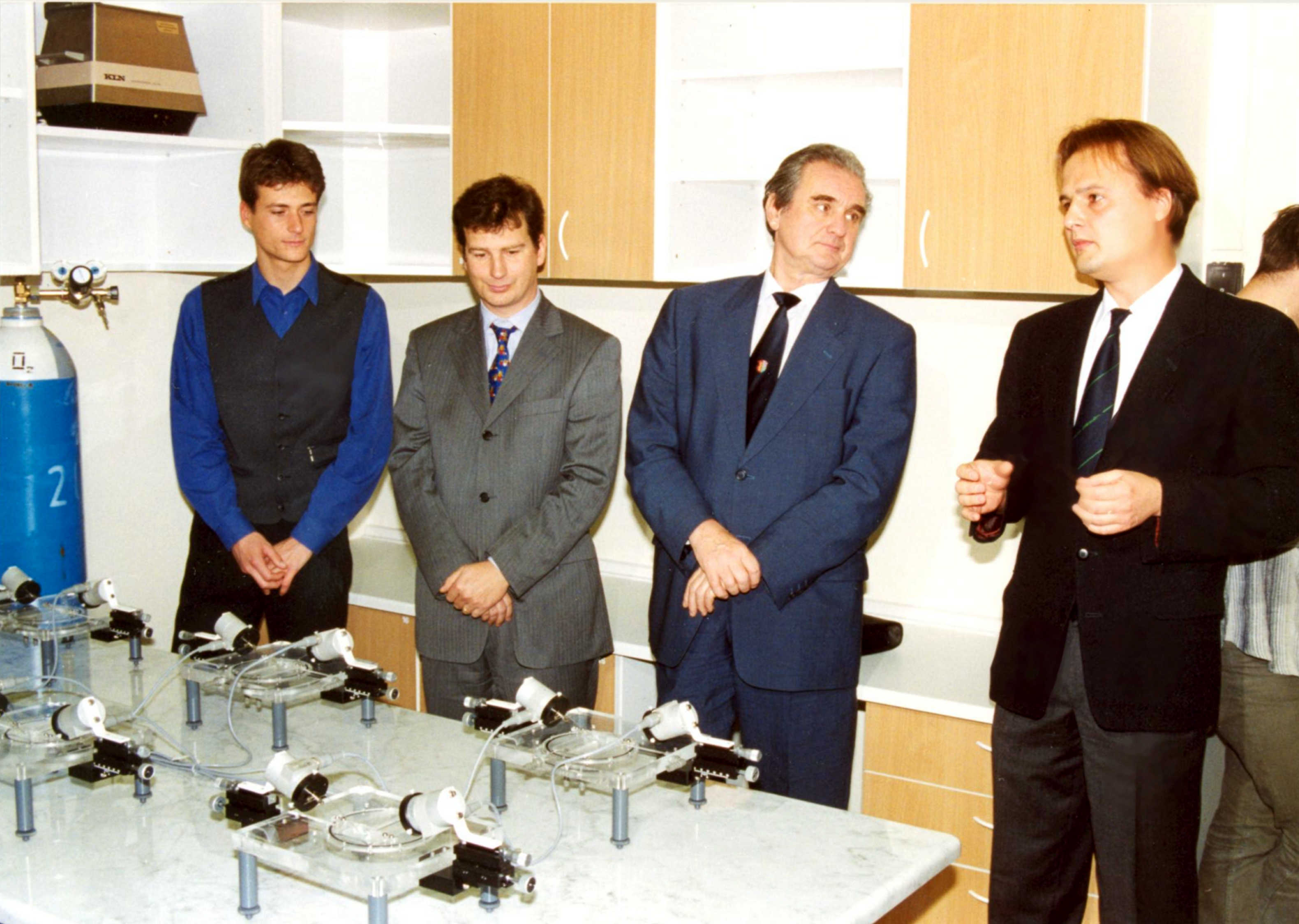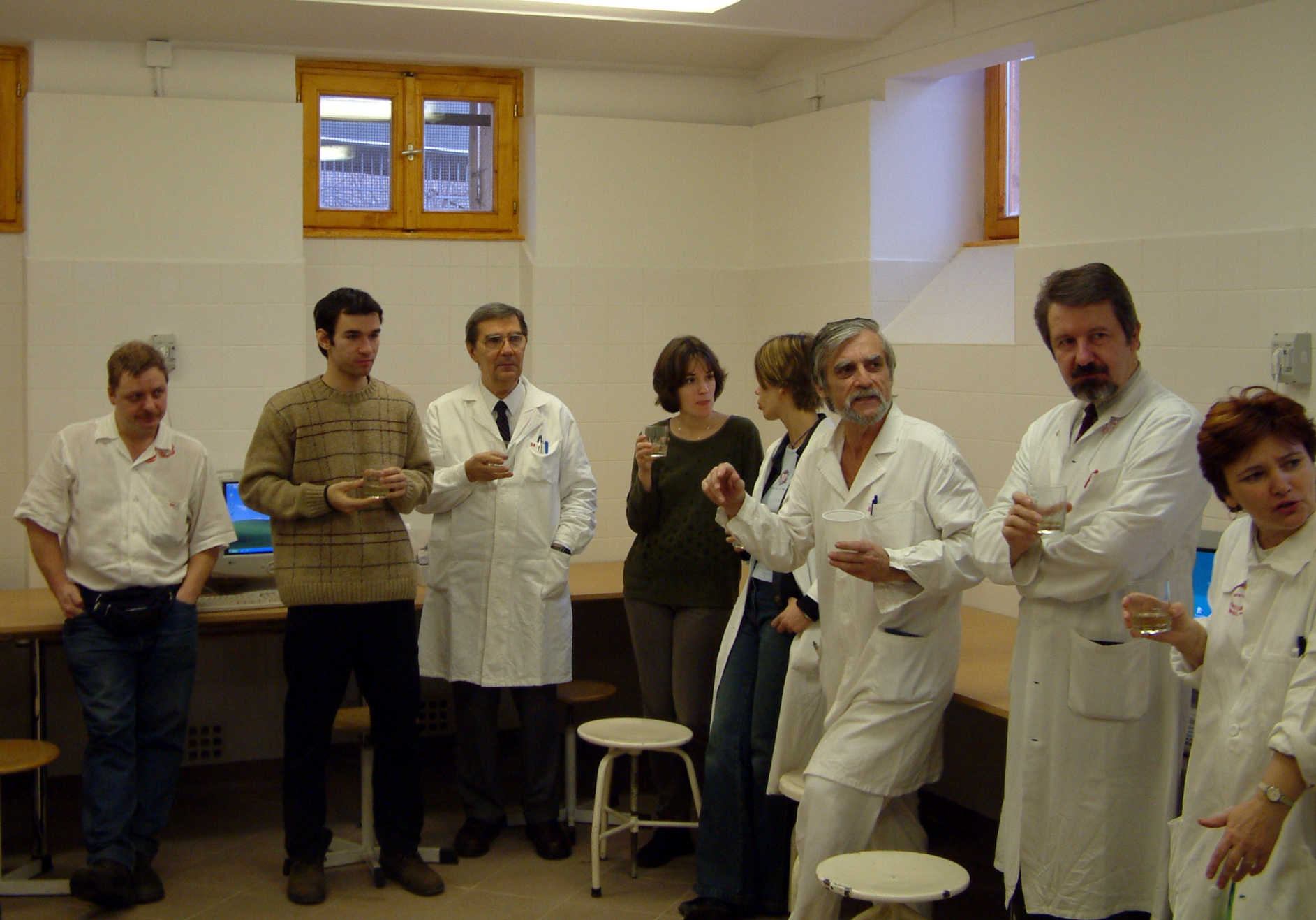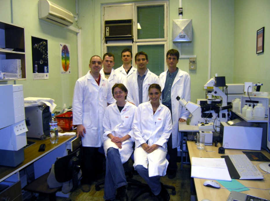 Az épülő „konfokális” csoport, a Szövetépítő laboratórium magja, az intézet régi villamostechnikai helyiségében. Álló sor, jobbról balra: Lacza Zsombor, laboratóriumvezető, mellette Orosz Gábor, Csordás Attila, Weszl Miklós, Cselenyák Attila; ülnek: Kugler Eszter és Vácz Gabriella