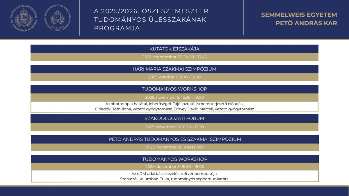A Pető András Kar 2025. őszi szemeszterre tervezett tudományos ÜLÉSsorozata Hári SzimpóziumPető SzimpóziumTudományos hírektudományos ülés Ha érdekesnek találta, ossza meg!