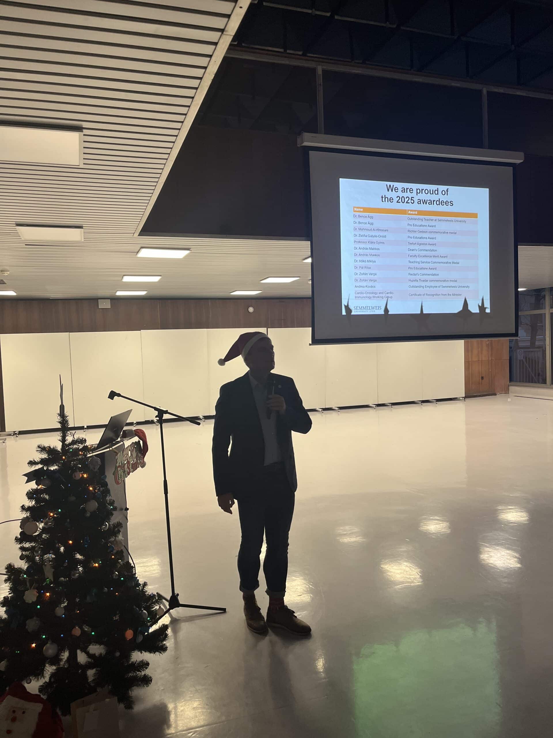Az ünnepi rendezvényt Prof. Dr. Ferdinandy Péter igazgató úr köszöntője nyitotta meg, aki beszédében kiemelte az intézet közösségének szakmai elkötelezettségét, az oktatásban, kutatásban elért sikereket, valamint megköszönte a munkatársak egész éves, magas színvonalú munkáját. Szavai nemcsak az elmúlt év eredményeit foglalták össze, hanem megerősítették az intézet közösségi erejének és együttműködésének jelentőségét is.