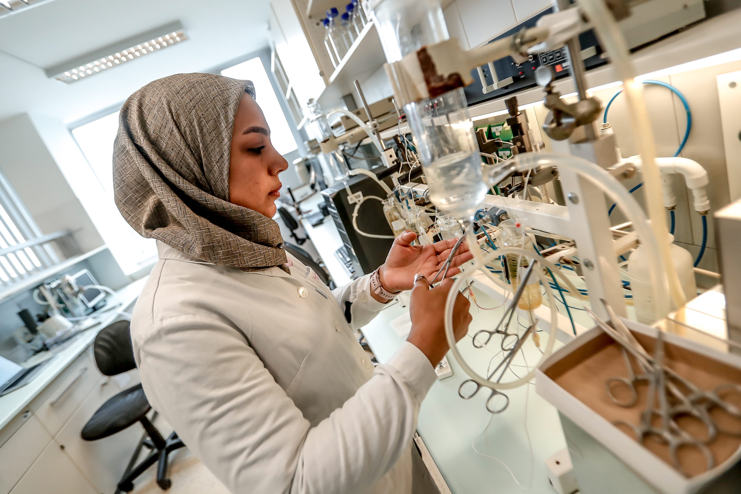 Alkalmazott módszerek, eszközök: A patkány tail-flick fájdalommodell, patkány rotarod, egész testes pletizmográfia, ADP-GloTM lumineszcens kináz vizsgálati rendszer (PKCγ Kinase Enzyme System), Western blot, kapilláris elektroforézis-lézer indukált fluoreszcencia, immunhisztokémia, receptor kötődési kísérletek és patch clamp.