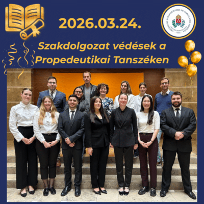 2026.03.23-án sikerrel zajlott le a Propedeutikai Tanszéken a szakdolgozatok védése. Szeretettel gratulálunk minden érintett hallgatóknak a sikeres védéshez és tanulmányaikhoz és hivatásukhoz további sok sikert kívánunk!