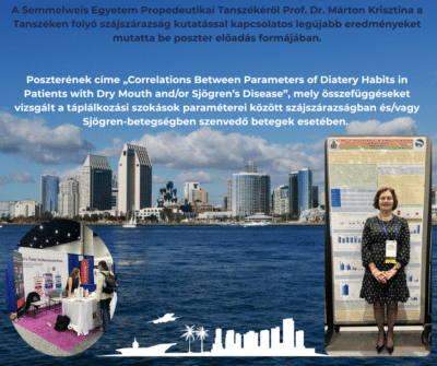 A világ legrangosabb fogorvosi kutatásokkal kapcsolatos konferenciáján a Semmelweis Egyetem Propedeutikai Tanszékéről Prof. Dr. Márton Krisztina a Tanszéken folyó szájszárazság kutatással kapcsolatos legújabb eredményeket mutatta be poszter előadás formájában. Poszterének címe „Correlations Between Parameters of Diatery Habits in Patients with Dry Mouth and/or Sjögren’s Disease”, mely összefüggéseket vizsgált a táplálkozási szokások paraméterei között szájszárazságban és/vagy Sjögren-betegségben szenvedő betegek esetében.
