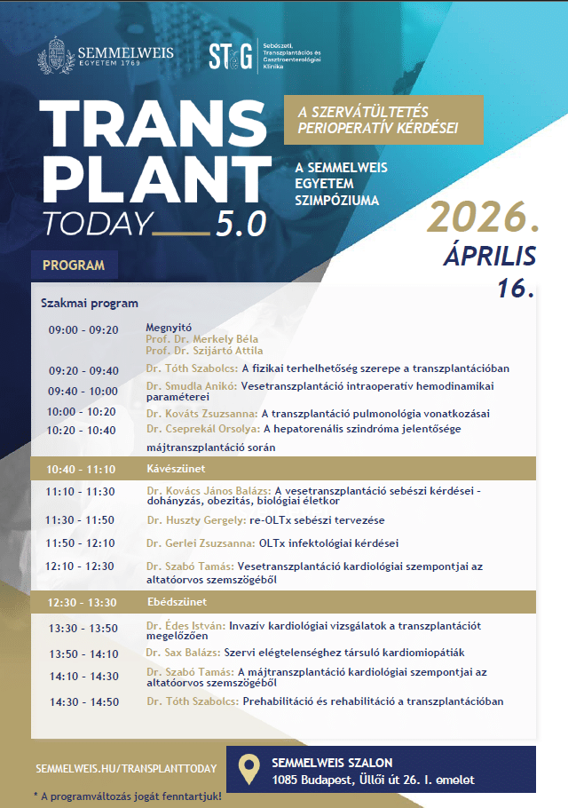 Klinikánk 5. alkalommal rendezi meg a Transplant Today szakmai napot, amelynek idei fókusza a szervátültetés perioperatív kérdései és a transzplantációra való felkészítés.