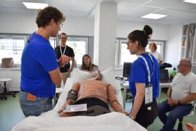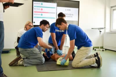 Idén is Klinikánk készítette fel a versenyzőket a traumás beteg ellátásához szükséges sürgősségi készségekre, gyakoroltuk a hallgatókkal a kommunikációt, elsősegélynyújtást, mentőhívást, manuális nyaki gerinc stabilizációt, nyakrögzítő és headblock használatát, különböző vérzéscsillapítási módokat, medenceöv és tourniquet felhelyezését, légmell detenzionálását, súlyos sérült mozgatását, hordágyra helyezését és rögzítését.