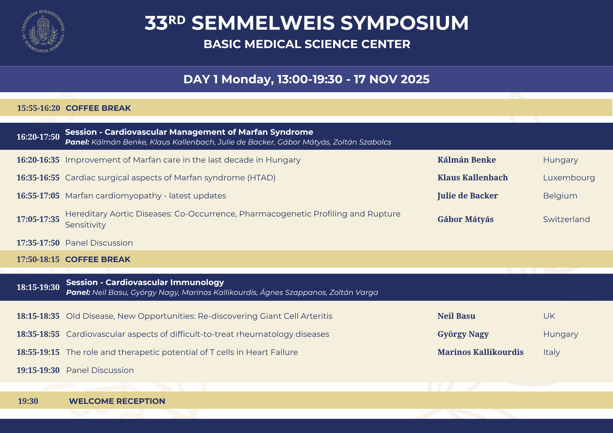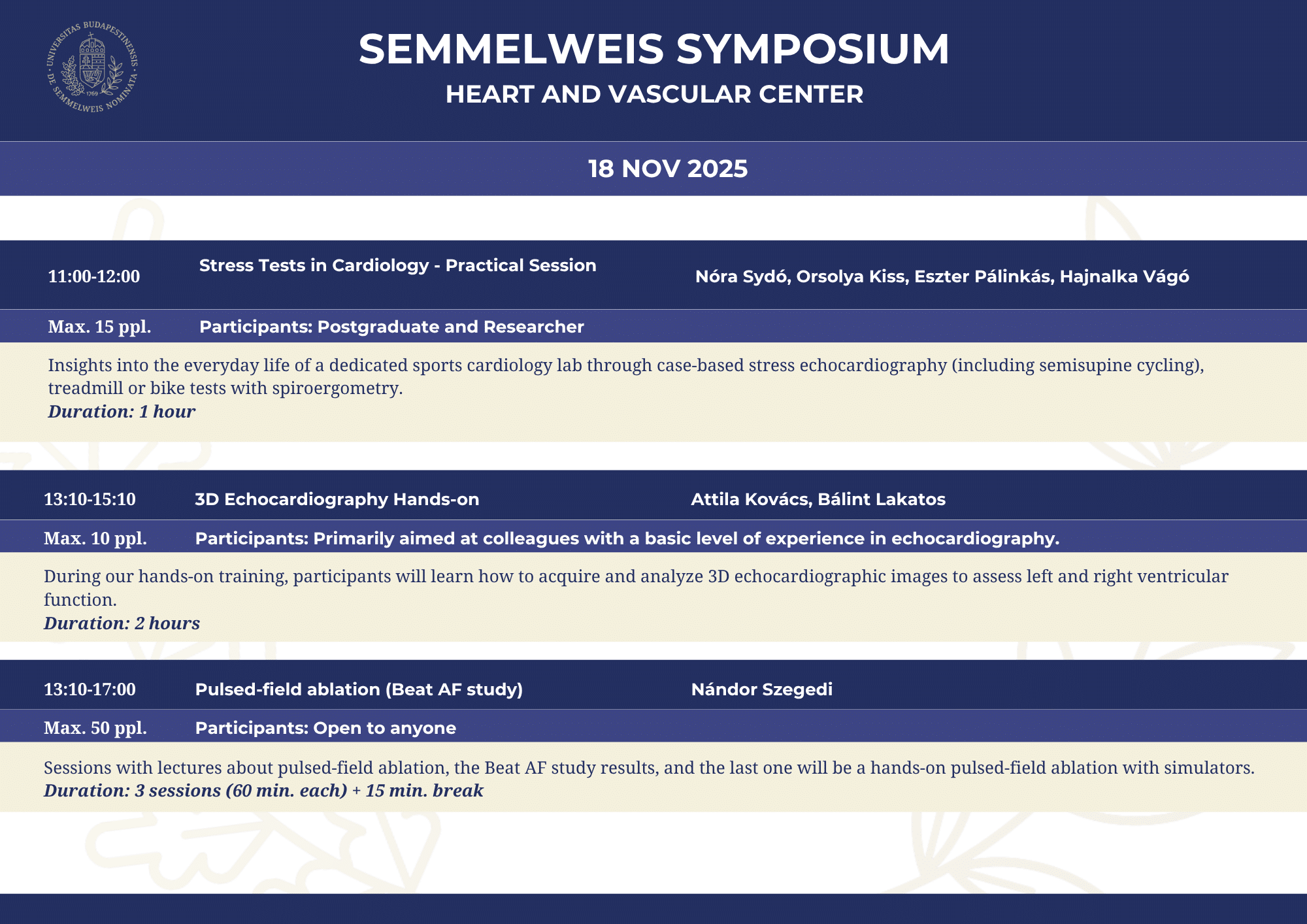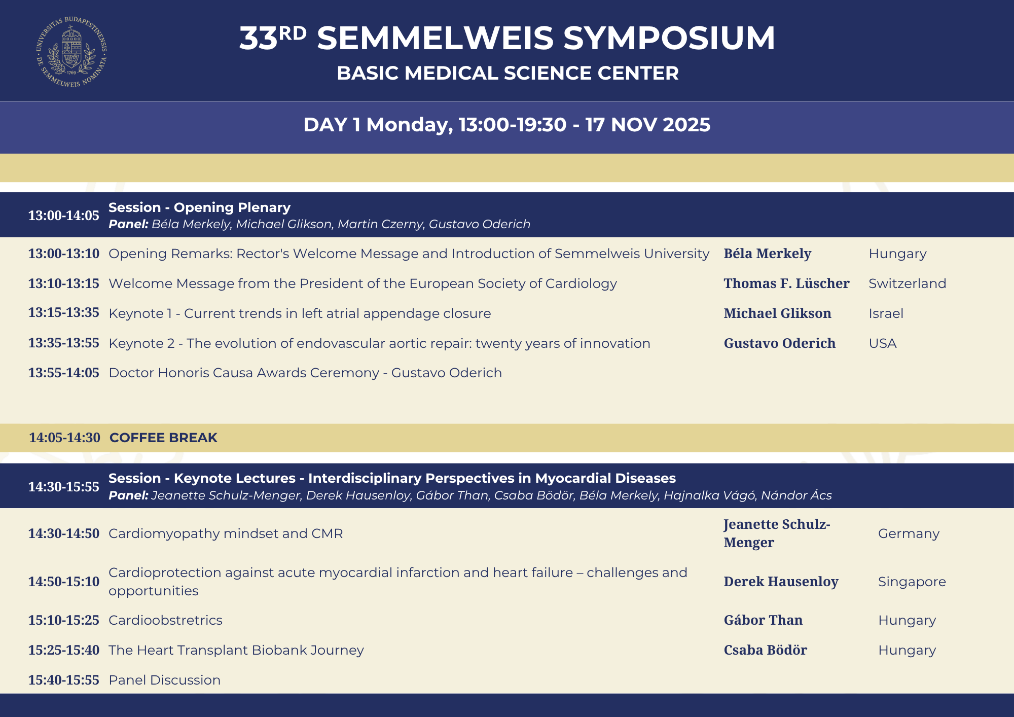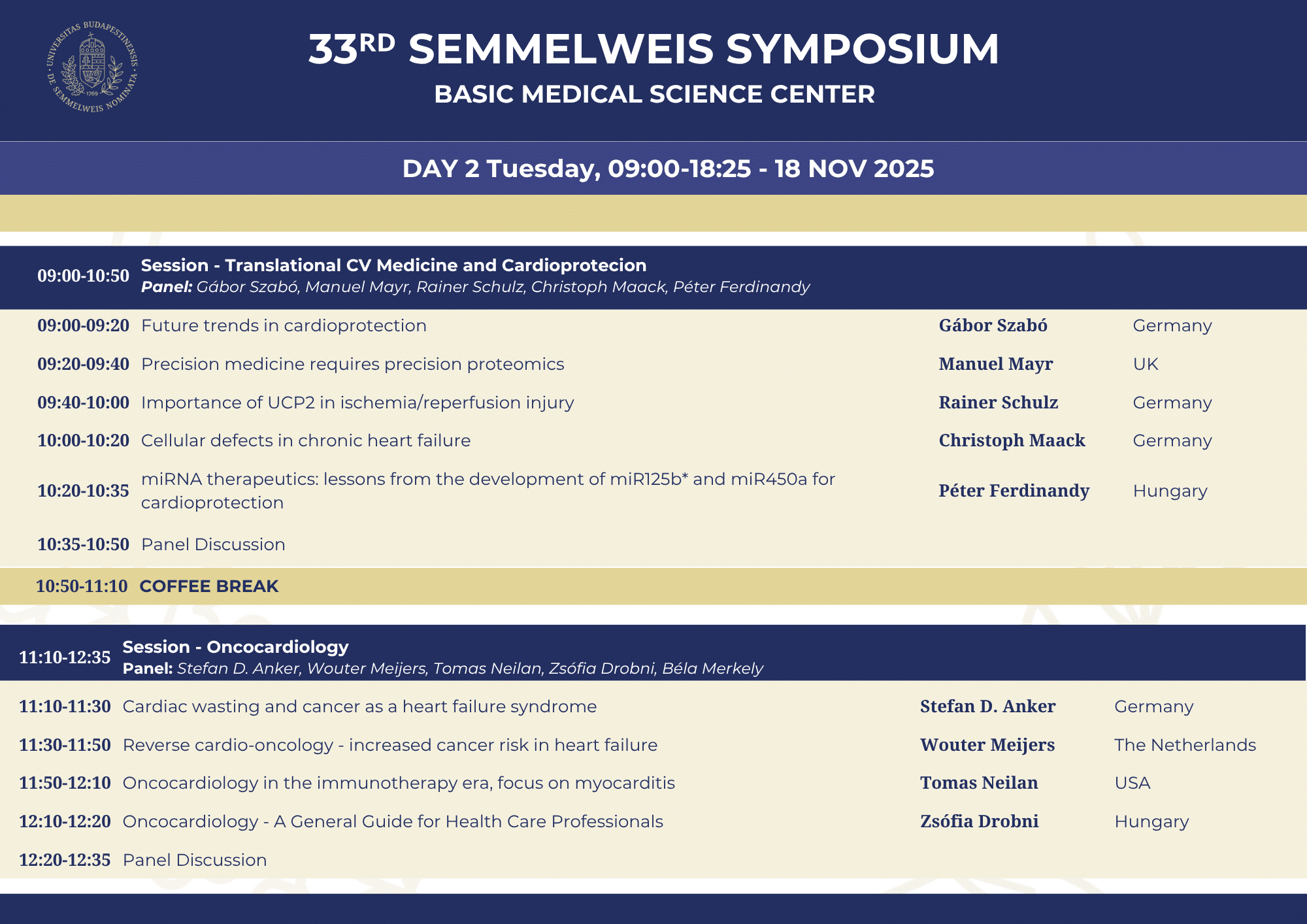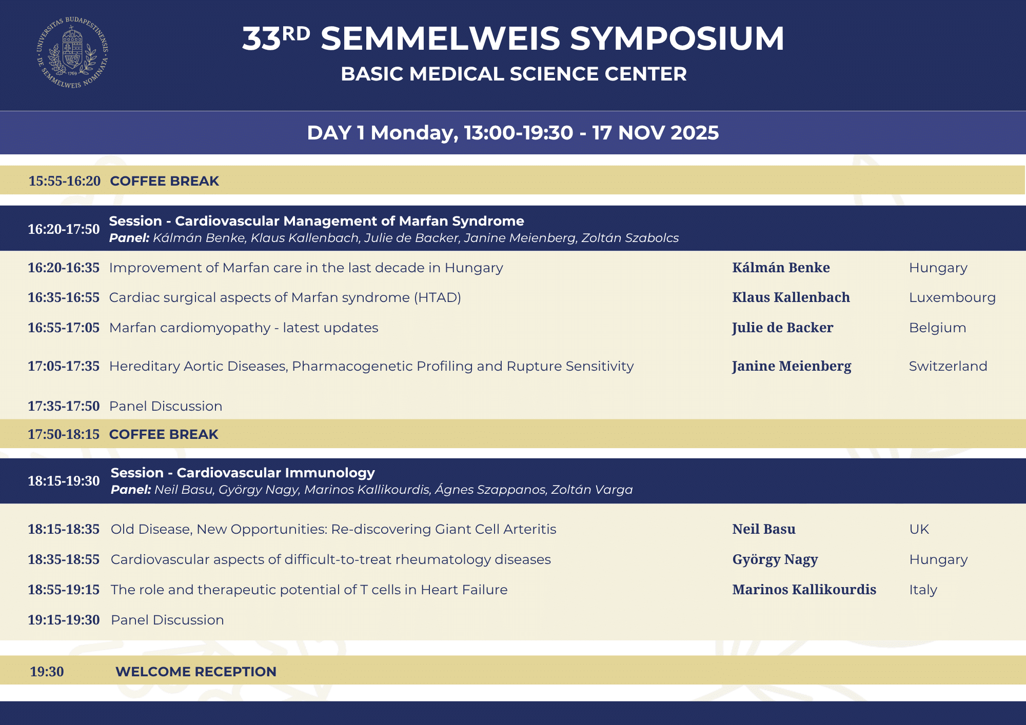 These are the preliminary programs of the 2025 Semmelweis Symposium and may be altered or updated before the event opens. The event will be held at two locations. Click here for the Program of the Basic Medical Science Center Click here for the Program of the Heart and Vascular Center Registration Abstract upload Venue: Basic Medical Science center 1094 BUDAPEST, TŰZOLTÓ U. 37-47. Venue: Heart and Vascular Center of Semmelweis University 1122 Budapest, Városmajor u. 68. workshops