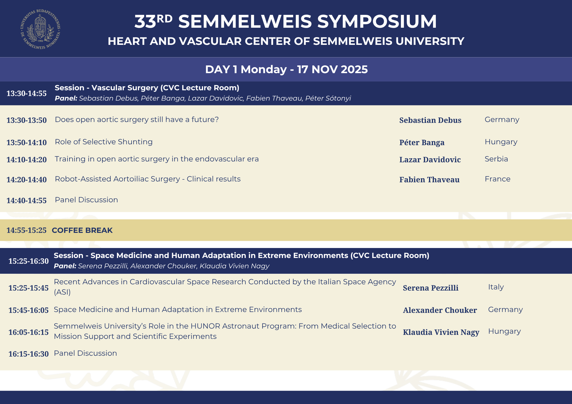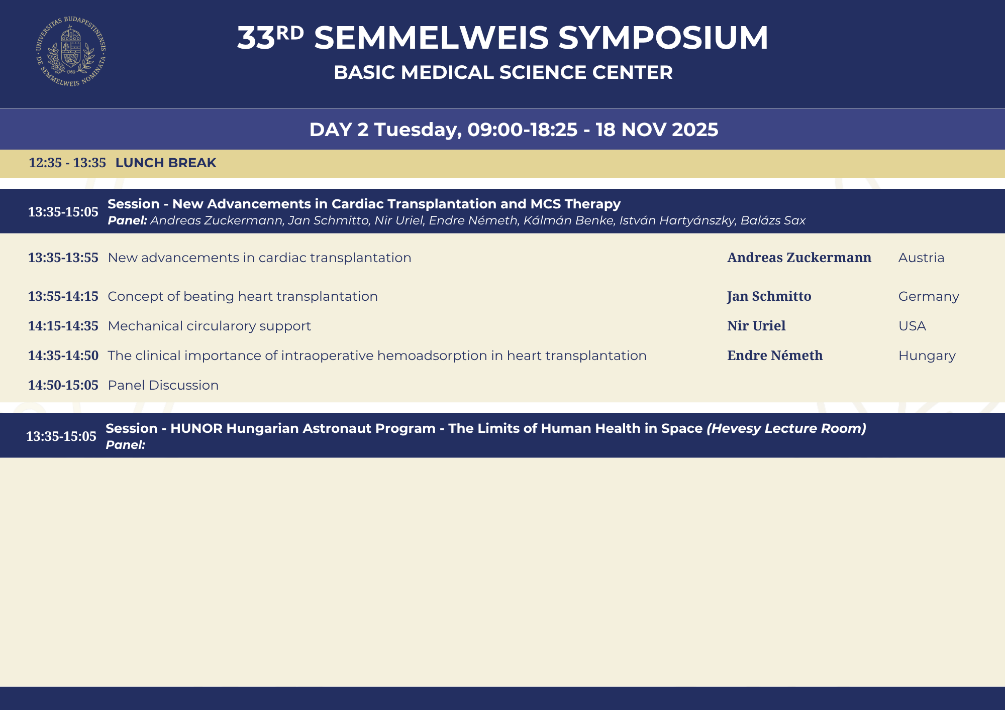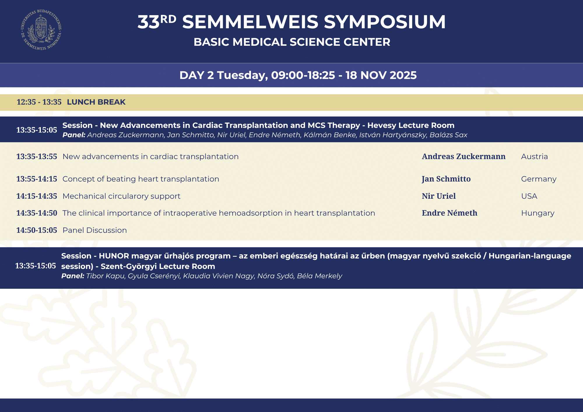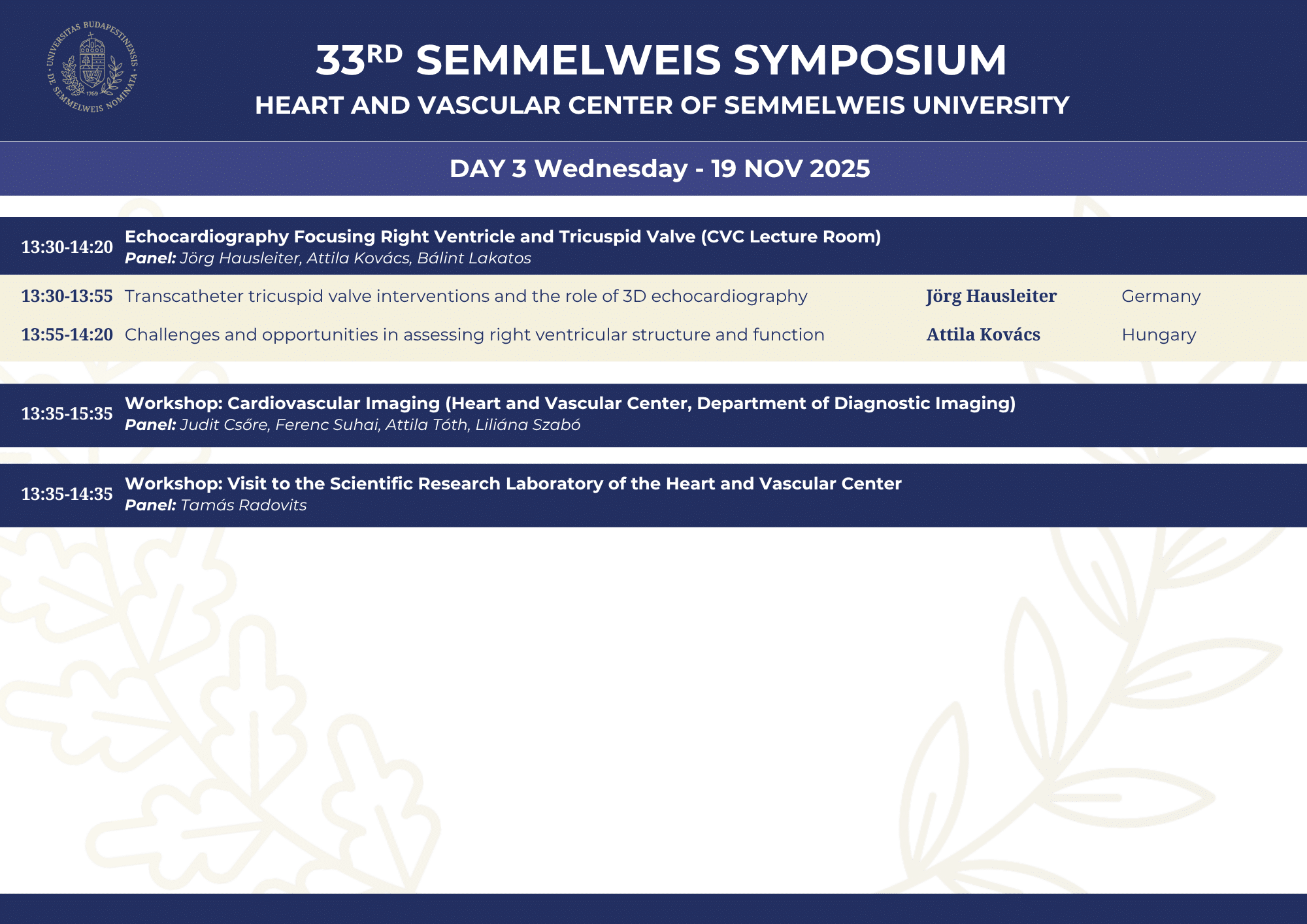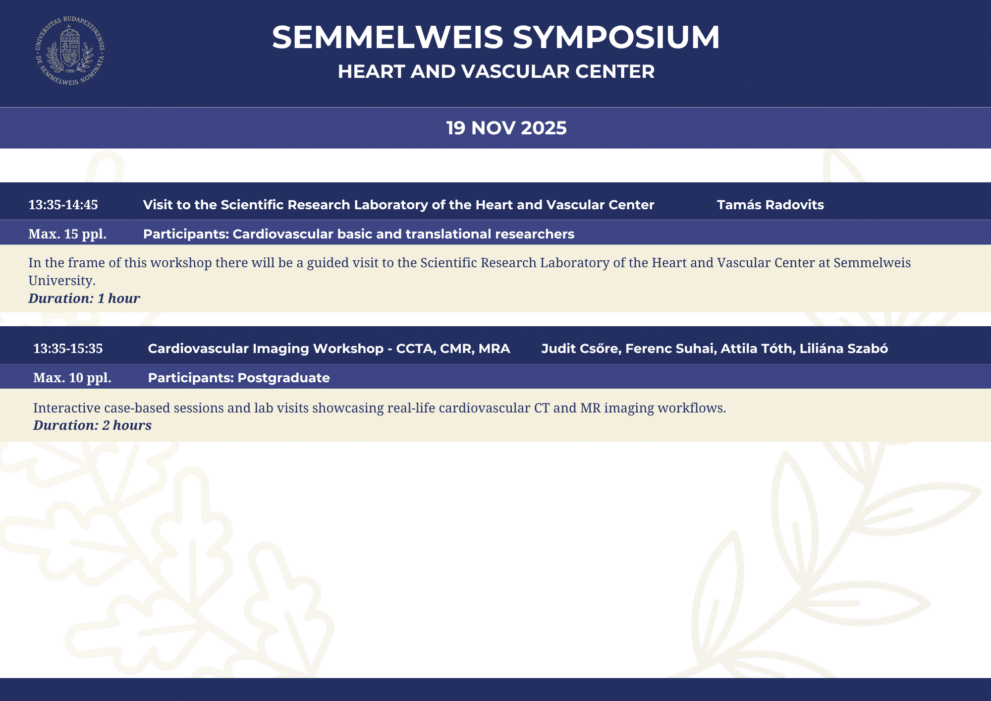 These are the preliminary programs of the 2025 Semmelweis Symposium and may be altered or updated before the event opens. The event will be held at two locations. Click here for the Program of the Basic Medical Science Center Click here for the Program of the Heart and Vascular Center Registration Abstract upload Venue: Basic Medical Science center 1094 BUDAPEST, TŰZOLTÓ U. 37-47. Venue: Heart and Vascular Center of Semmelweis University 1122 Budapest, Városmajor u. 68. workshops