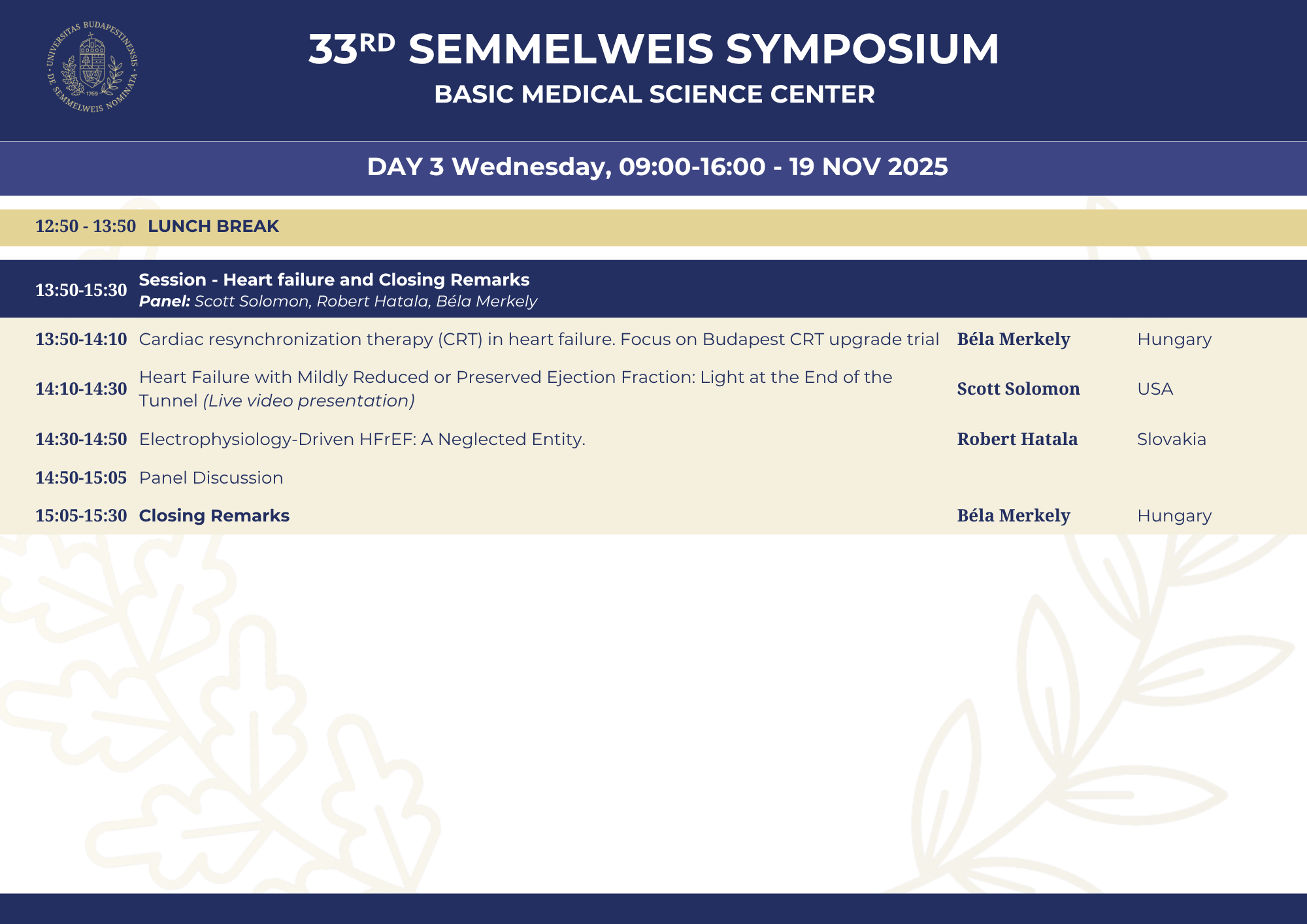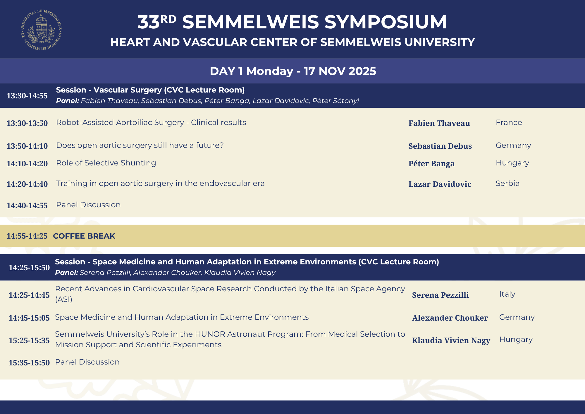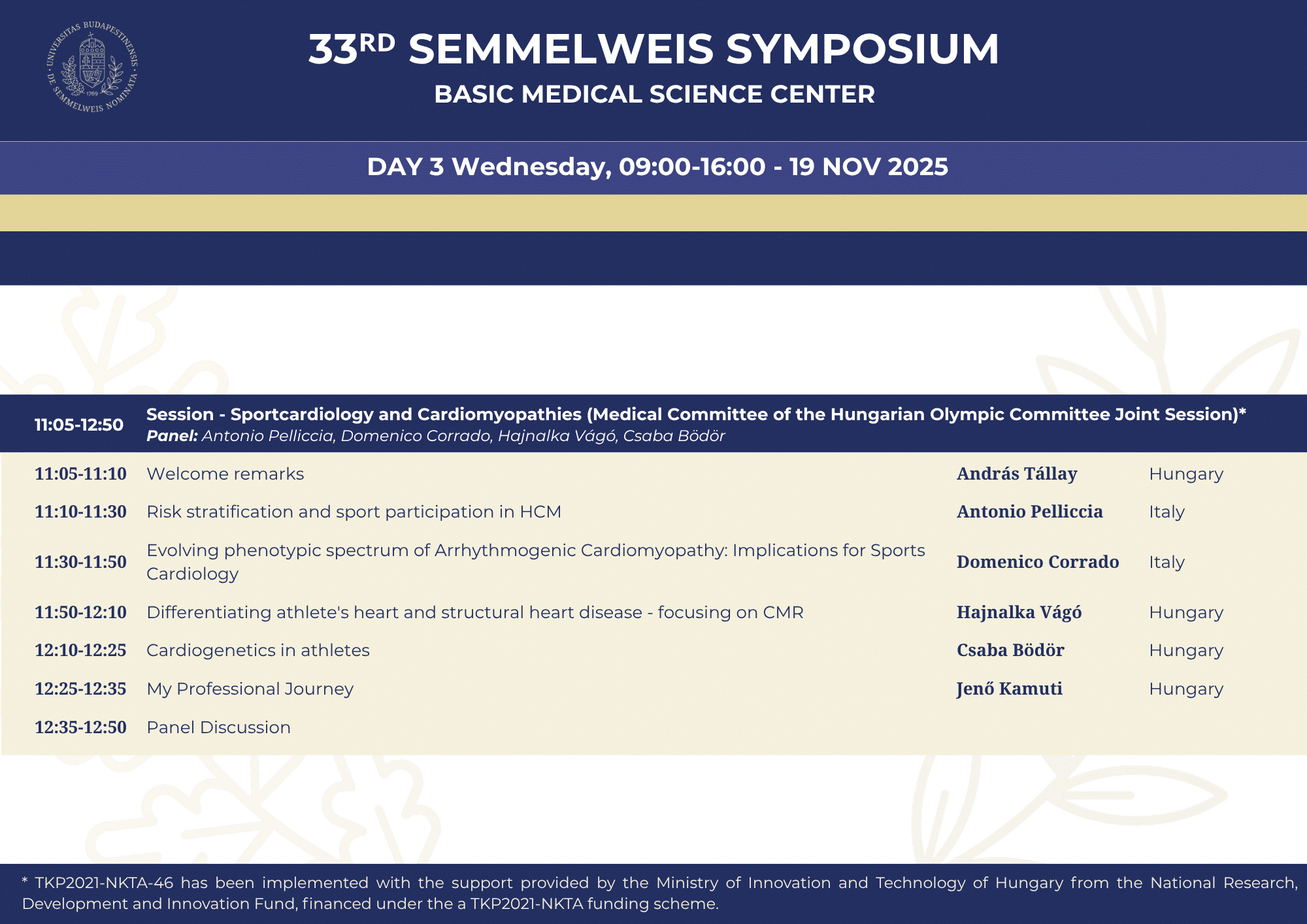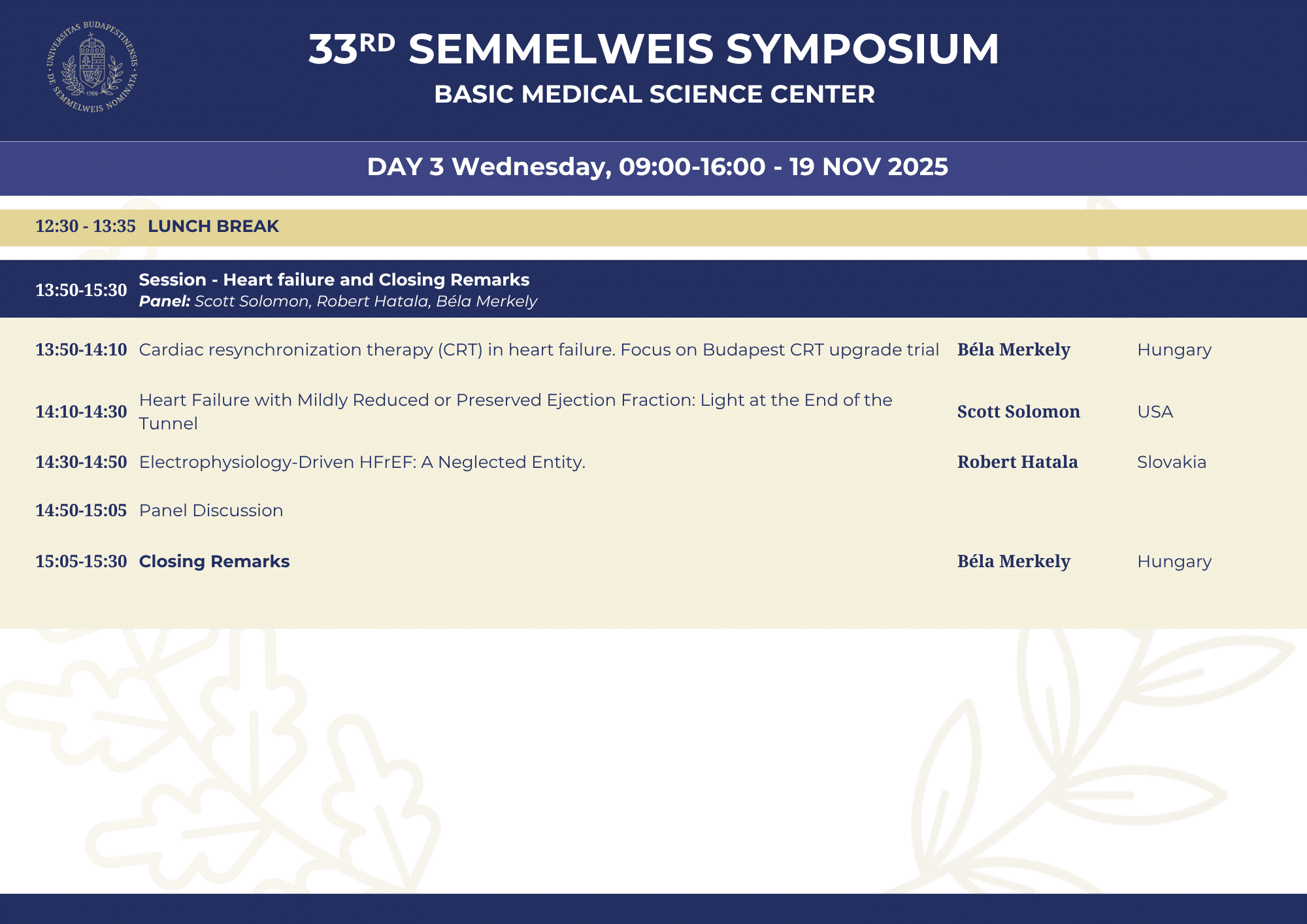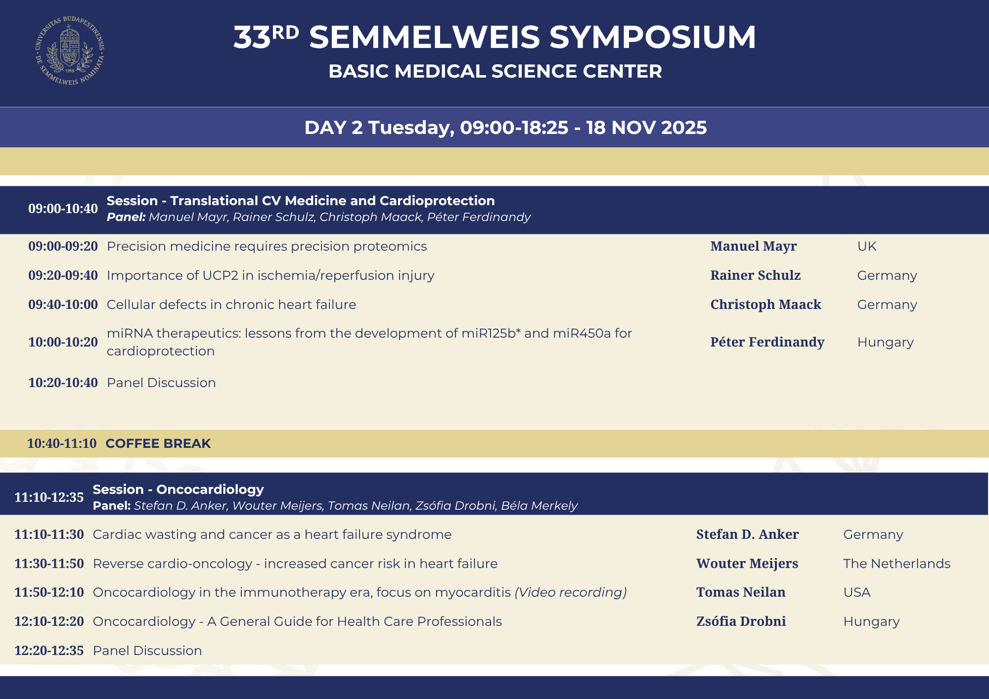 These are the preliminary programs of the 2025 Semmelweis Symposium and may be altered or updated before the event opens. The event will be held at two locations. Click here for the Program of the Basic Medical Science Center Click here for the Program of the Heart and Vascular Center Registration Abstract upload Venue: Basic Medical Science center 1094 BUDAPEST, TŰZOLTÓ U. 37-47. Venue: Heart and Vascular Center of Semmelweis University 1122 Budapest, Városmajor u. 68. workshops
