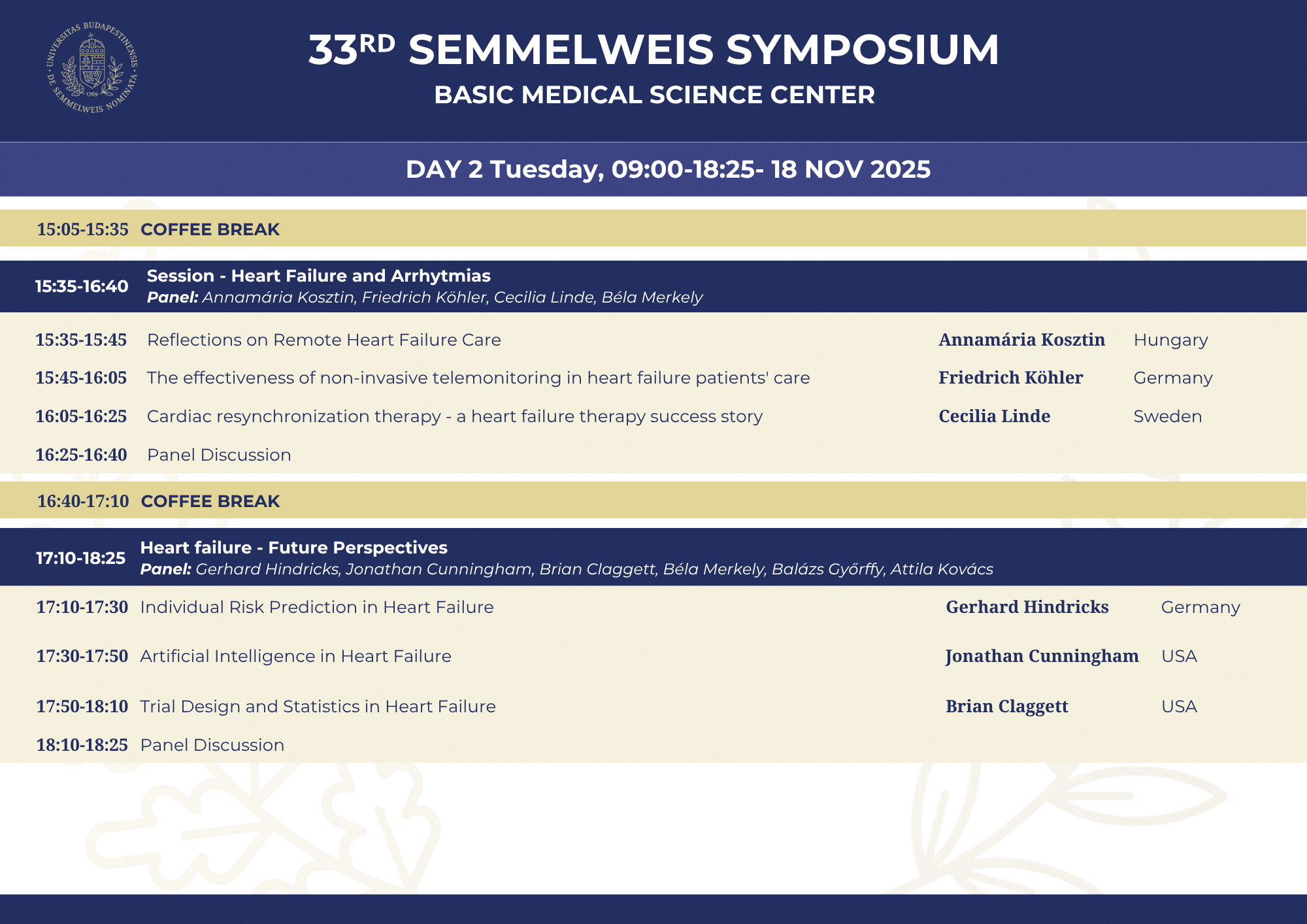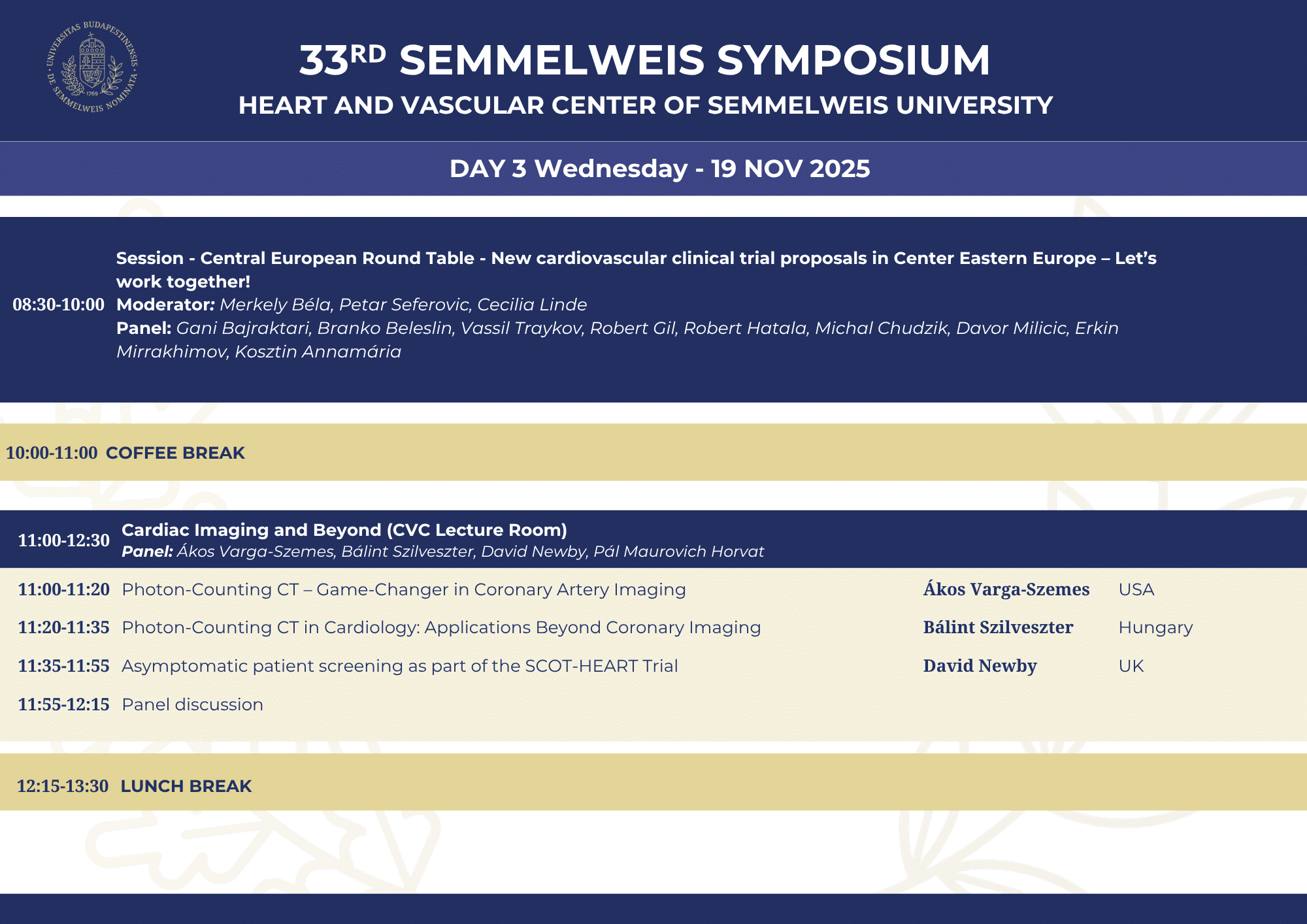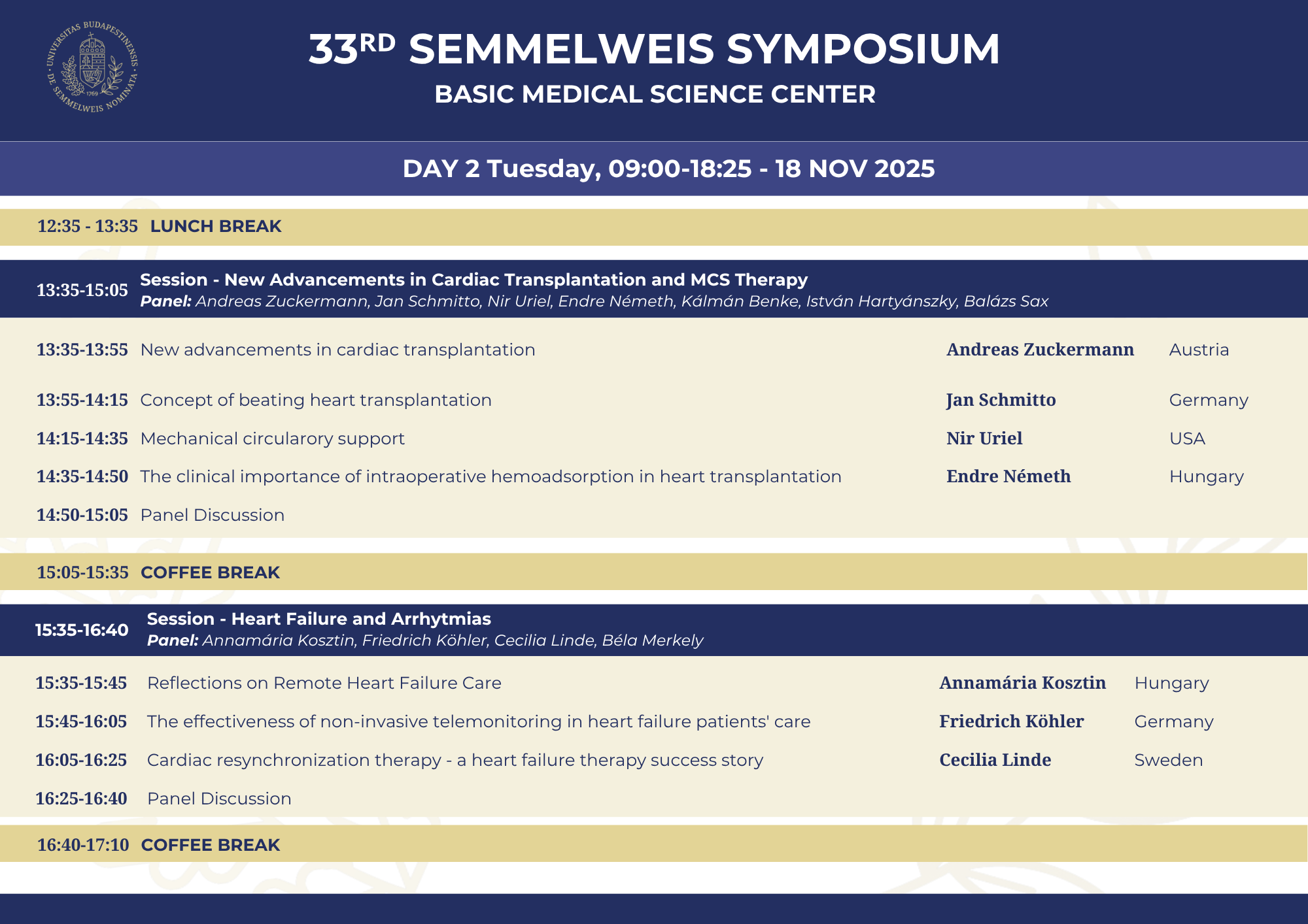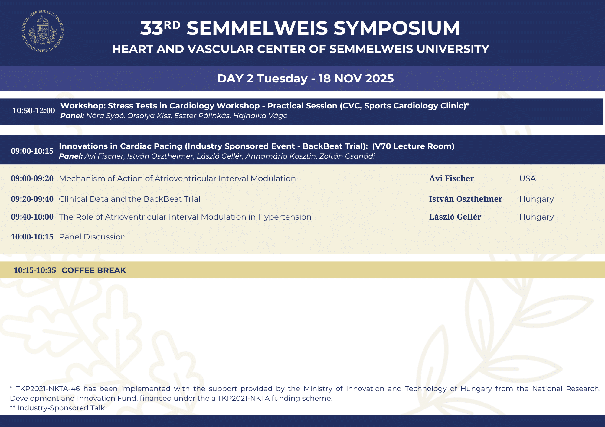 These are the preliminary programs of the 2025 Semmelweis Symposium and may be altered or updated before the event opens. The event will be held at two locations. Click here for the Program of the Basic Medical Science Center Click here for the Program of the Heart and Vascular Center Registration Abstract upload Venue: Basic Medical Science center 1094 BUDAPEST, TŰZOLTÓ U. 37-47. Venue: Heart and Vascular Center of Semmelweis University 1122 Budapest, Városmajor u. 68. workshops