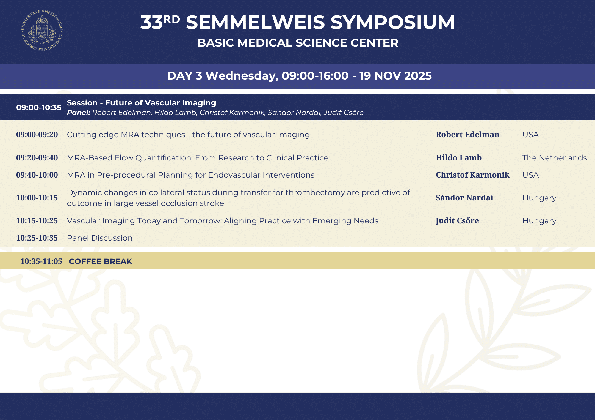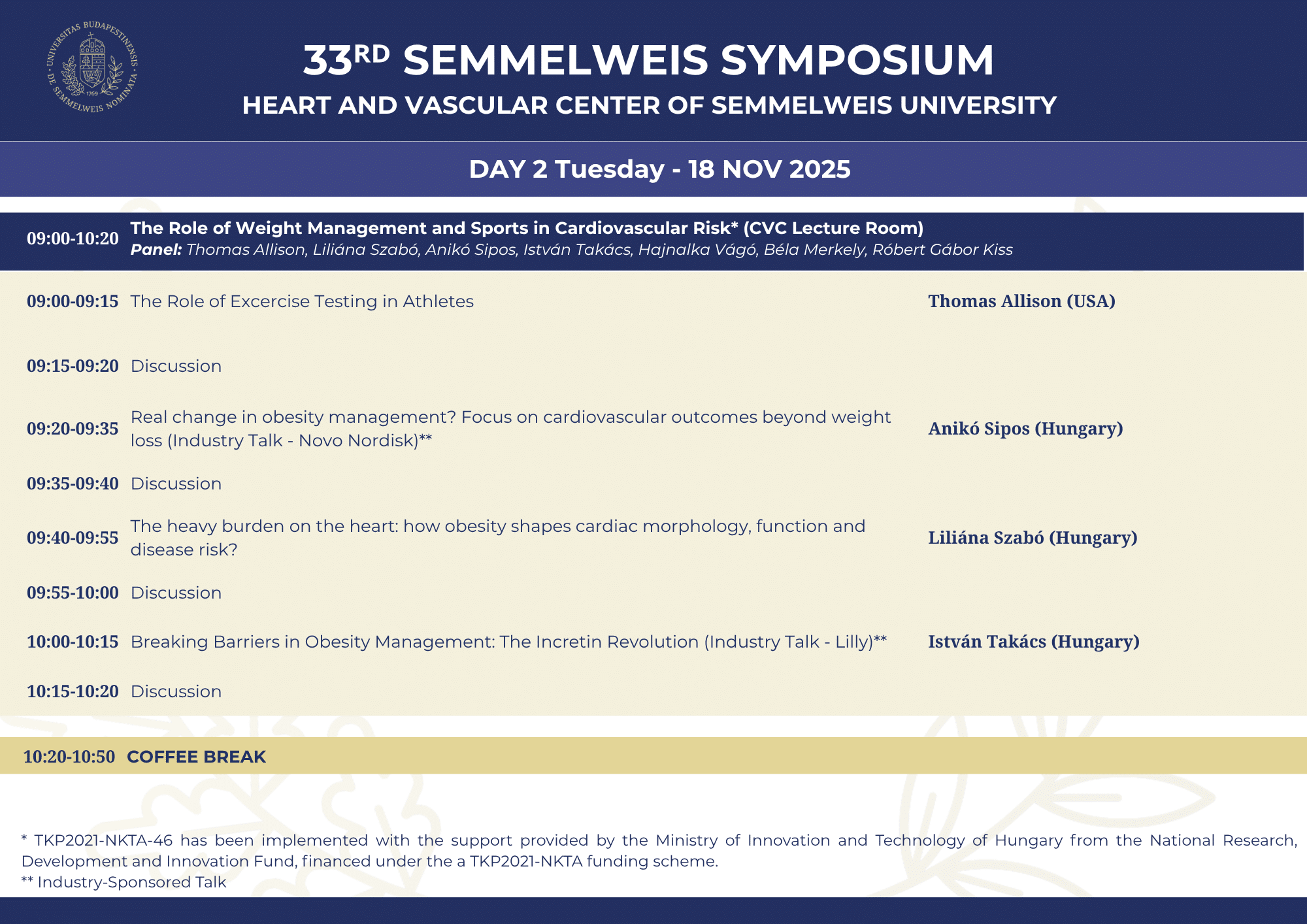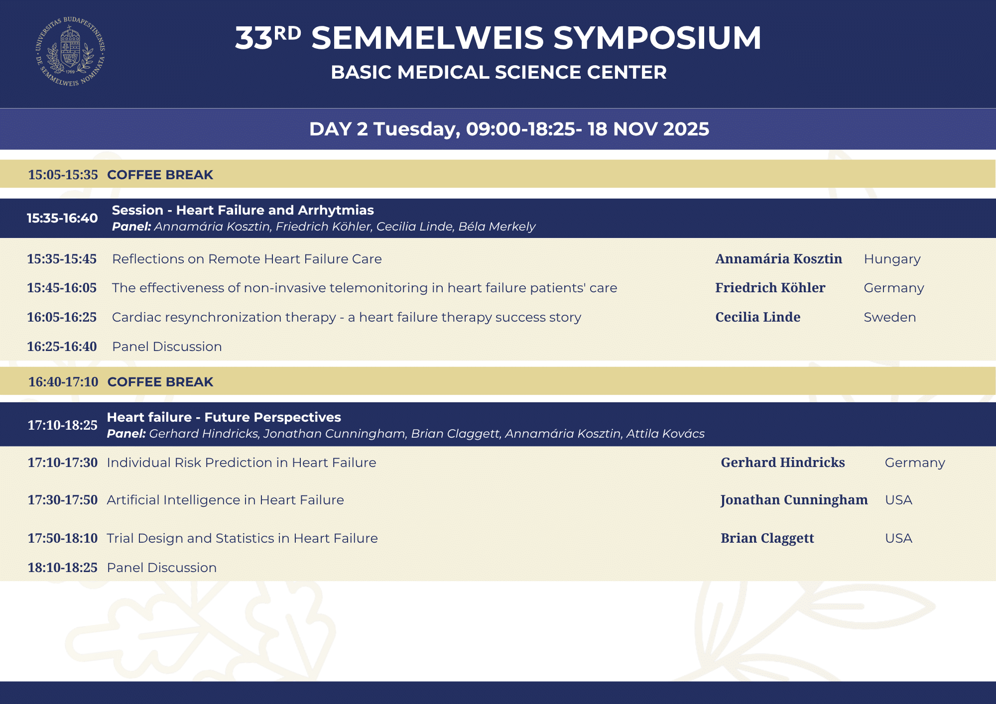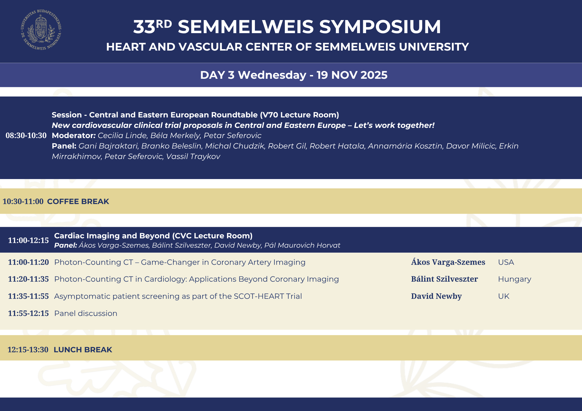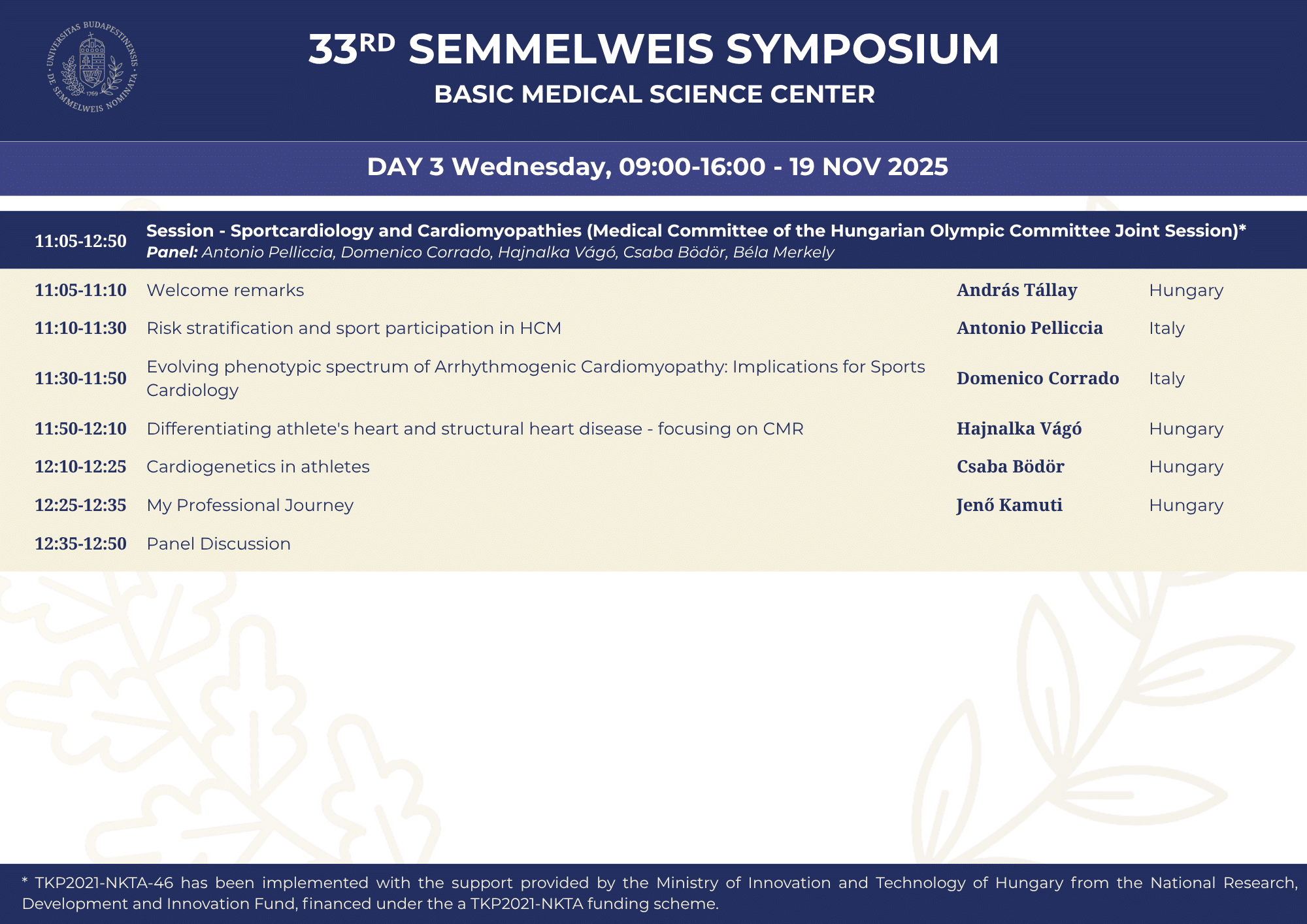 These are the preliminary programs of the 2025 Semmelweis Symposium and may be altered or updated before the event opens. The event will be held at two locations. Click here for the Program of the Basic Medical Science Center Click here for the Program of the Heart and Vascular Center Registration Abstract upload Venue: Basic Medical Science center 1094 BUDAPEST, TŰZOLTÓ U. 37-47. Venue: Heart and Vascular Center of Semmelweis University 1122 Budapest, Városmajor u. 68. workshops