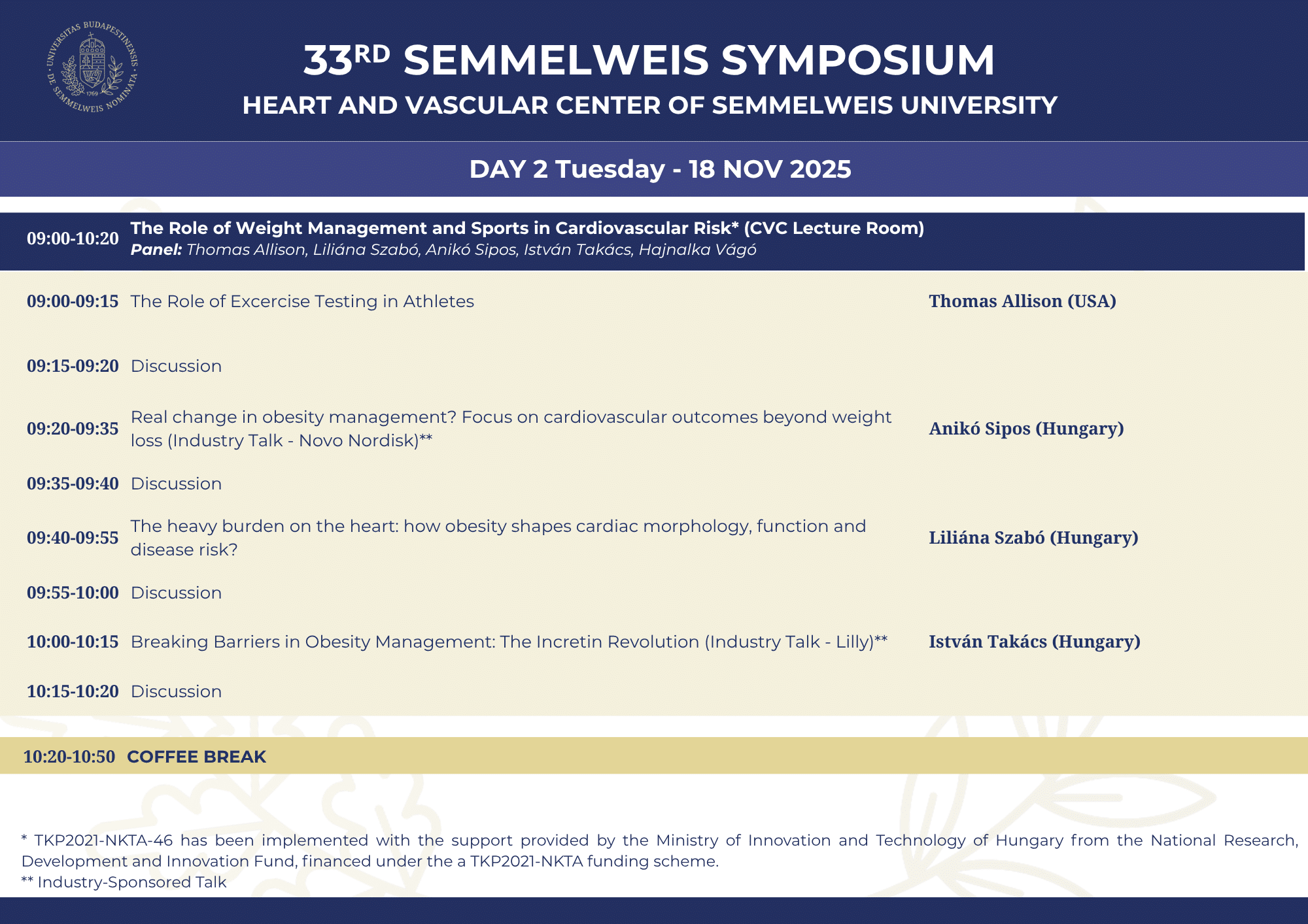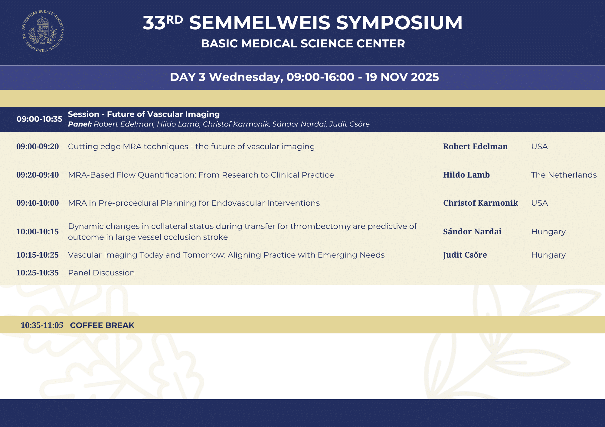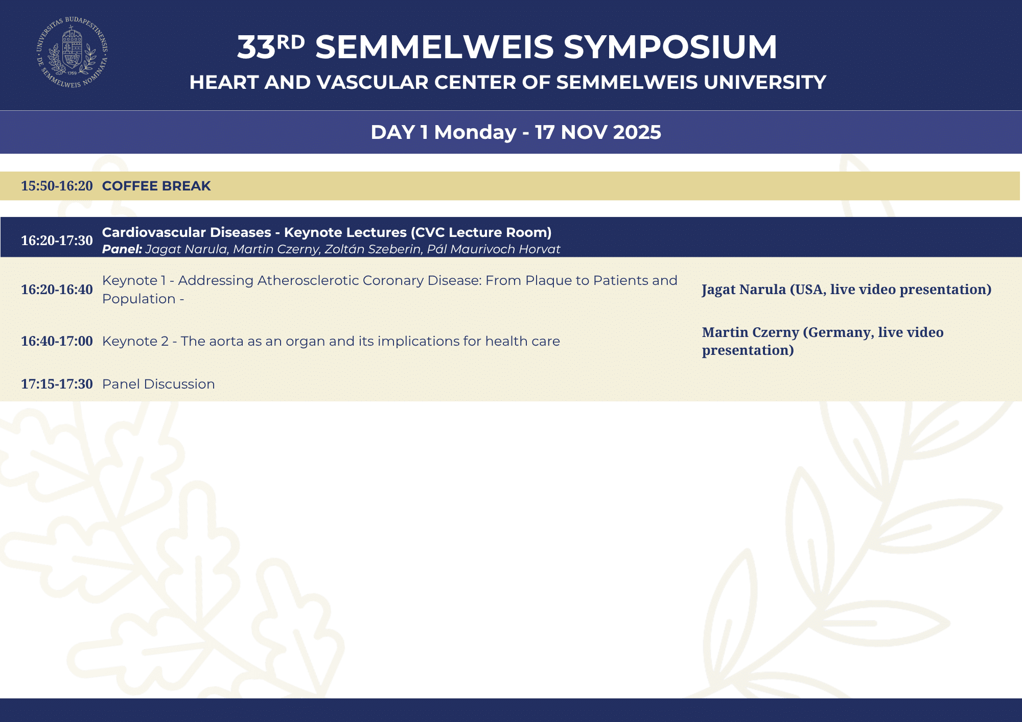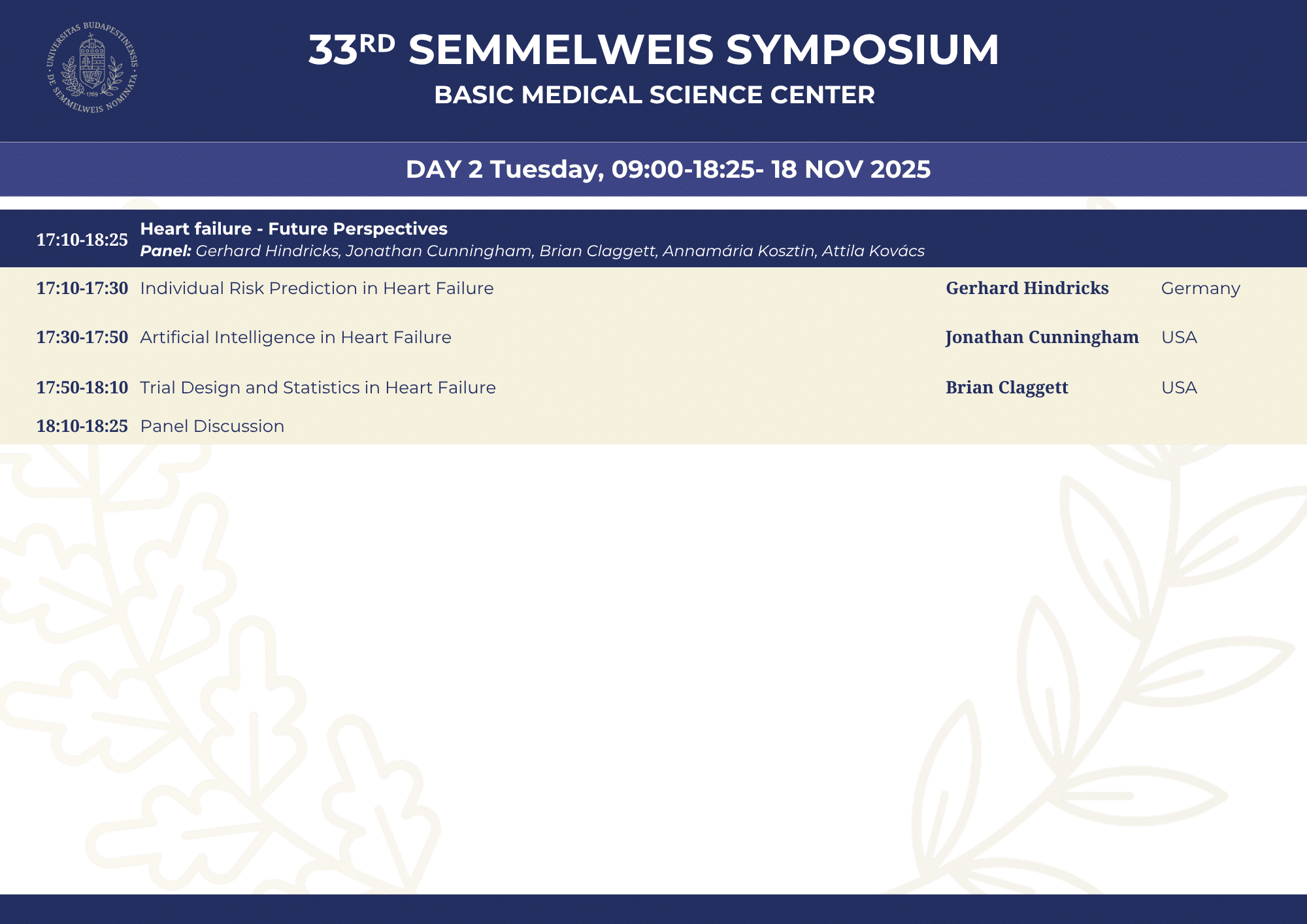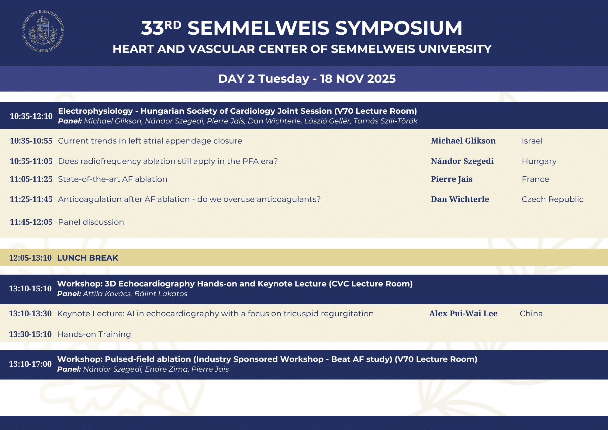 These are the preliminary programs of the 2025 Semmelweis Symposium and may be altered or updated before the event opens. The event will be held at two locations. Click here for the Program of the Basic Medical Science Center Click here for the Program of the Heart and Vascular Center Registration Abstract upload Venue: Basic Medical Science center 1094 BUDAPEST, TŰZOLTÓ U. 37-47. Venue: Heart and Vascular Center of Semmelweis University 1122 Budapest, Városmajor u. 68. workshops