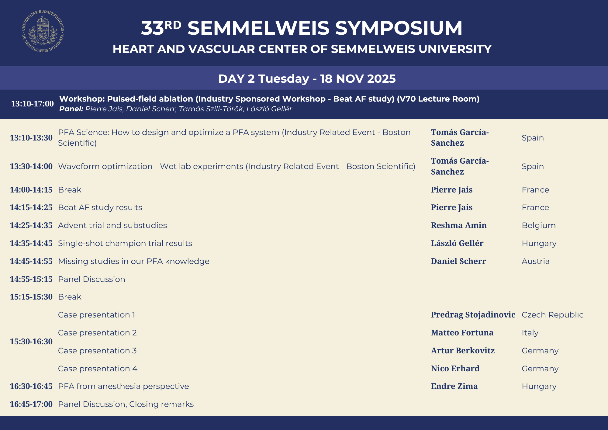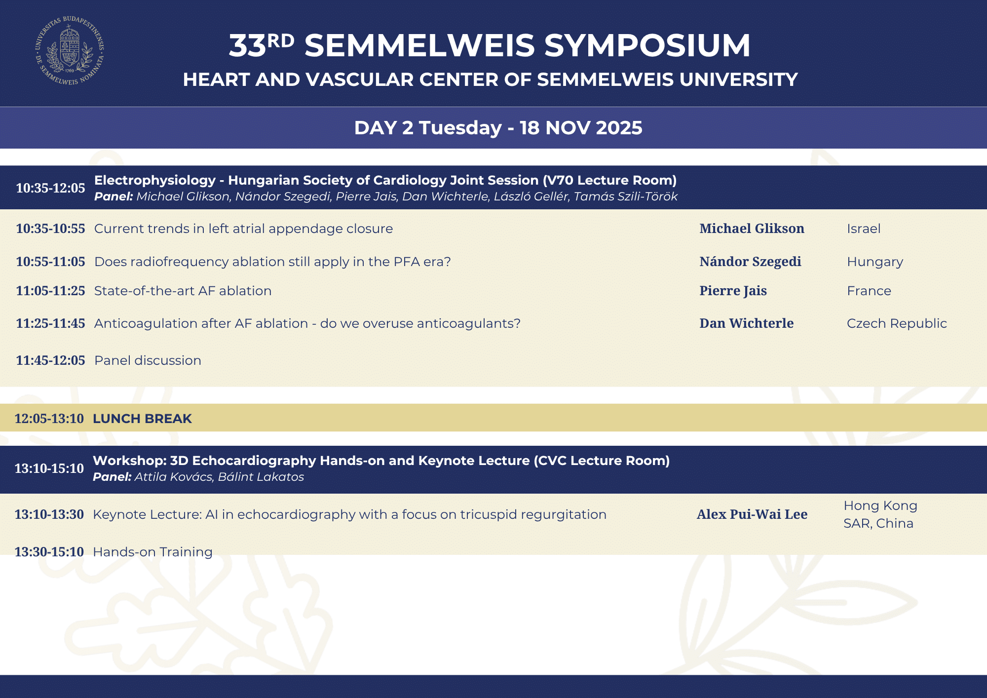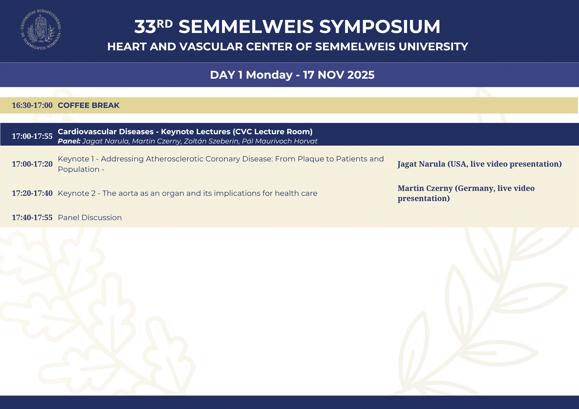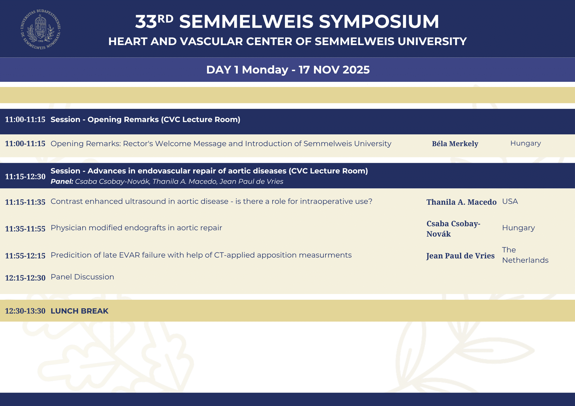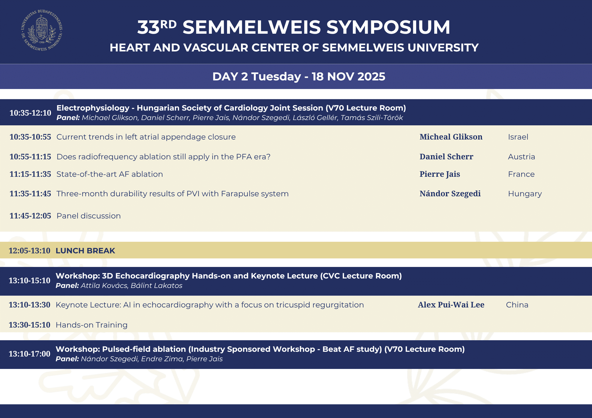 These are the preliminary programs of the 2025 Semmelweis Symposium and may be altered or updated before the event opens. The event will be held at two locations. Click here for the Program of the Basic Medical Science Center Click here for the Program of the Heart and Vascular Center Registration Abstract upload Venue: Basic Medical Science center 1094 BUDAPEST, TŰZOLTÓ U. 37-47. Venue: Heart and Vascular Center of Semmelweis University 1122 Budapest, Városmajor u. 68. workshops