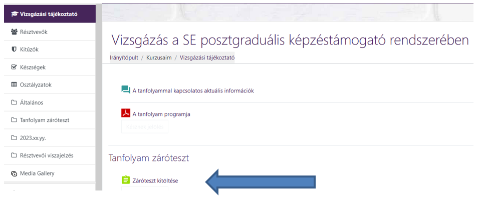 A Záróteszt kitöltése linkre kattintva megjelenik az az oldal, ahonnan a tesztkitöltés indítható.