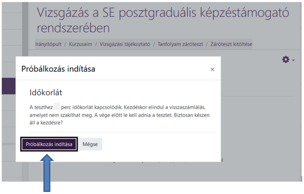 A teszt kitöltése nem automatikusan indul el. A véletlen indítást a rendszer biztonsági beállításai meggátolják. A teszt kitöltését ténylegesen a „Teszt megoldása most” szövegre kattintva lehet elkezdeni egy további biztonsági felugró panelen megjelenő „Próbálkozás indítása” gombra kattintva.