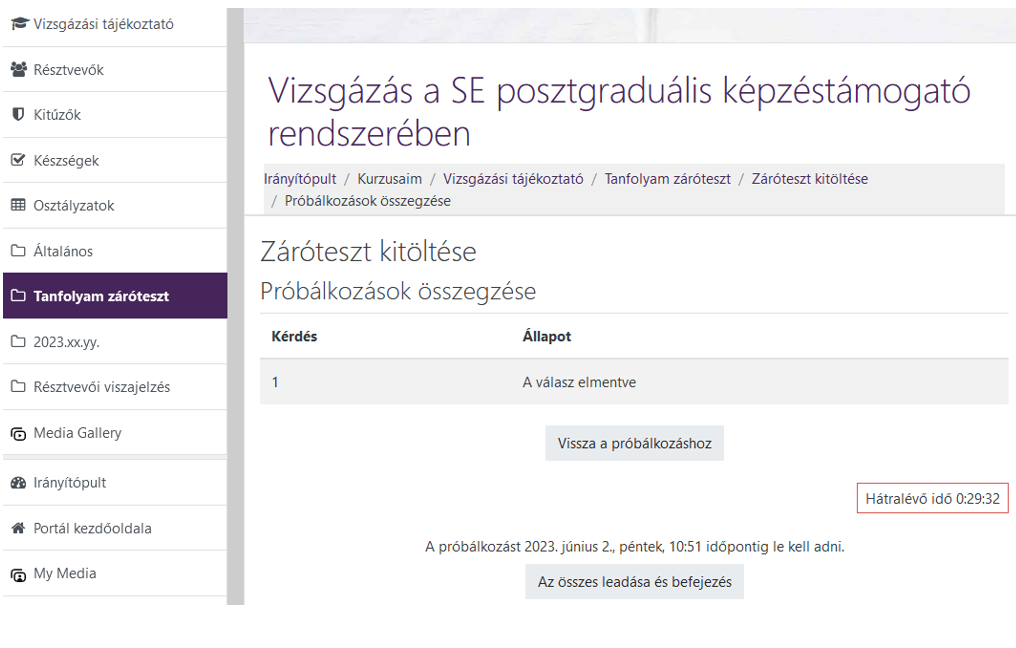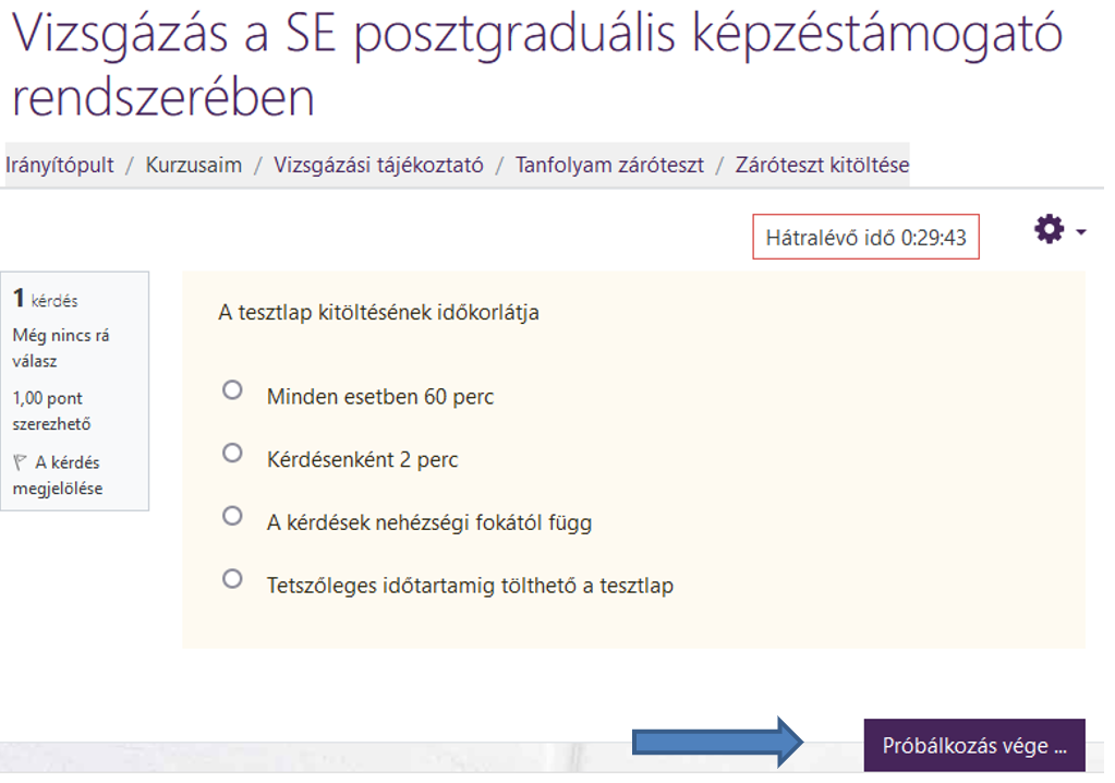 Amennyiben a kitöltési idő lejárta előtt végeznek a tesztkitöltéssel, a „Próbálkozás vége” szövegre kattintva tudják leadni a tesztet.