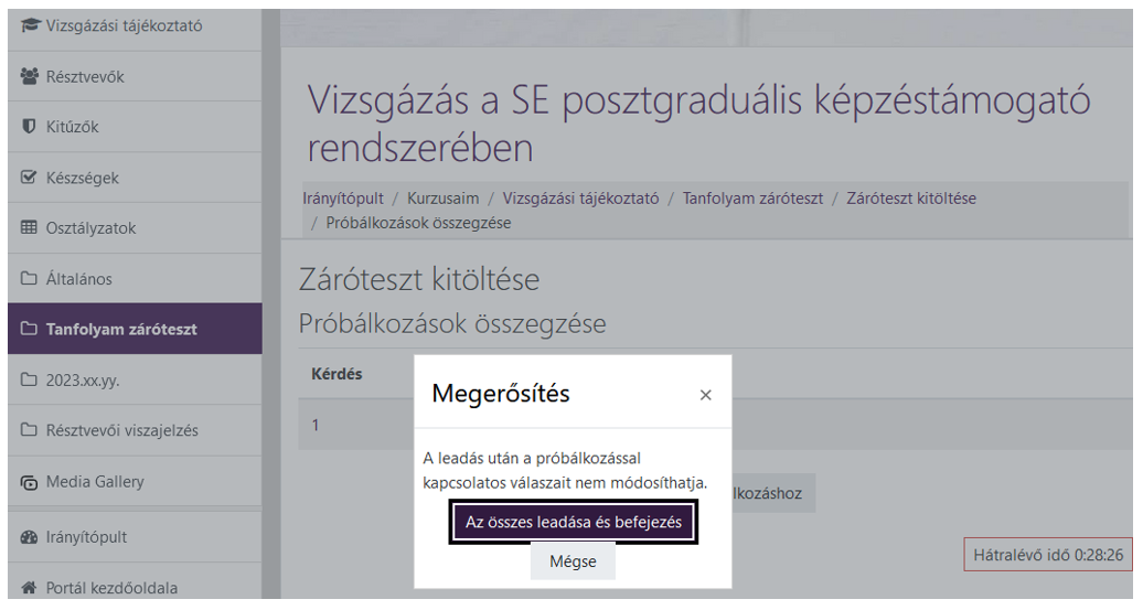 Ha „Az összes leadása és befejezése” gombot választja, a rendszer még egyszer rákérdez, hogy valóban le akarja-e adni a tesztet?