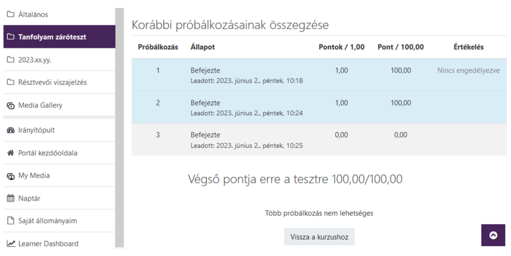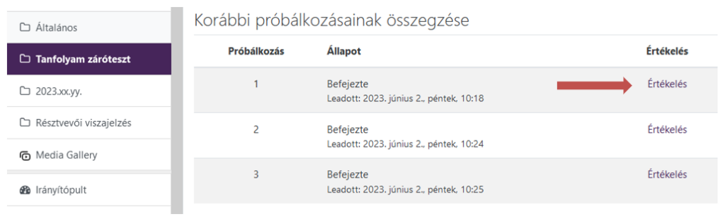 A teszt kitöltésére a tanfolyam zárását követően még legalább egy hétig van lehetősége. Ezután, ha az „Értékelés” szöveg olvasható az egyes próbálkozásokra vonatkozó sorok végén, erre kattintva megnézhetők a helyes válaszok.