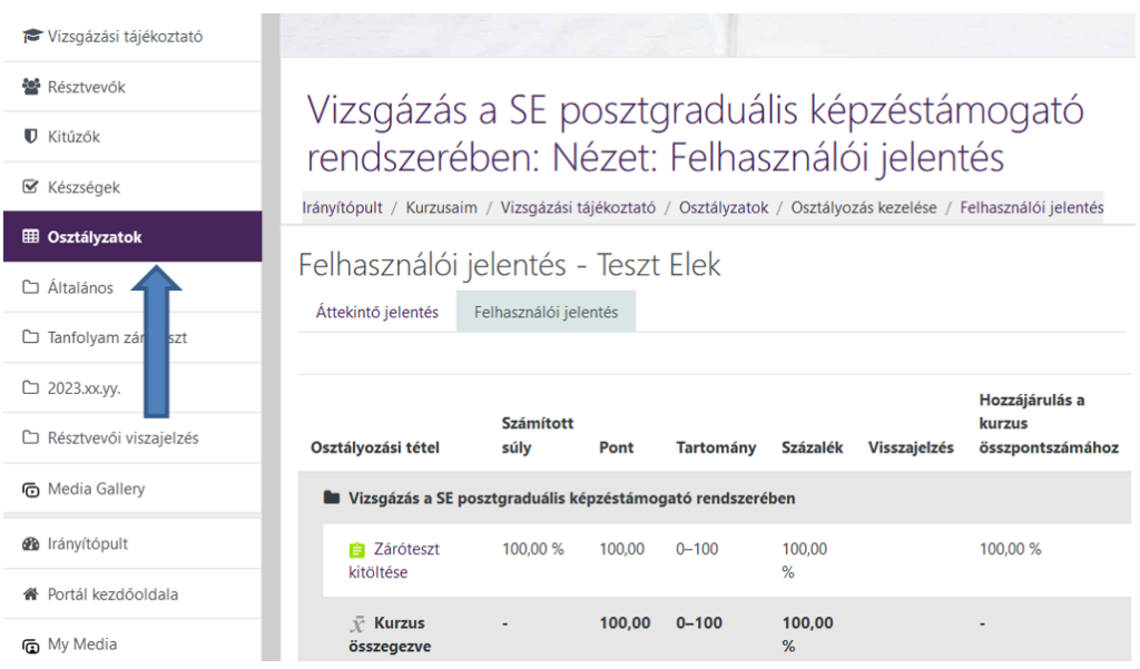 Az elért eredményét ismételten megtekintheti az „Osztályzatok” menüpontra kattintva.