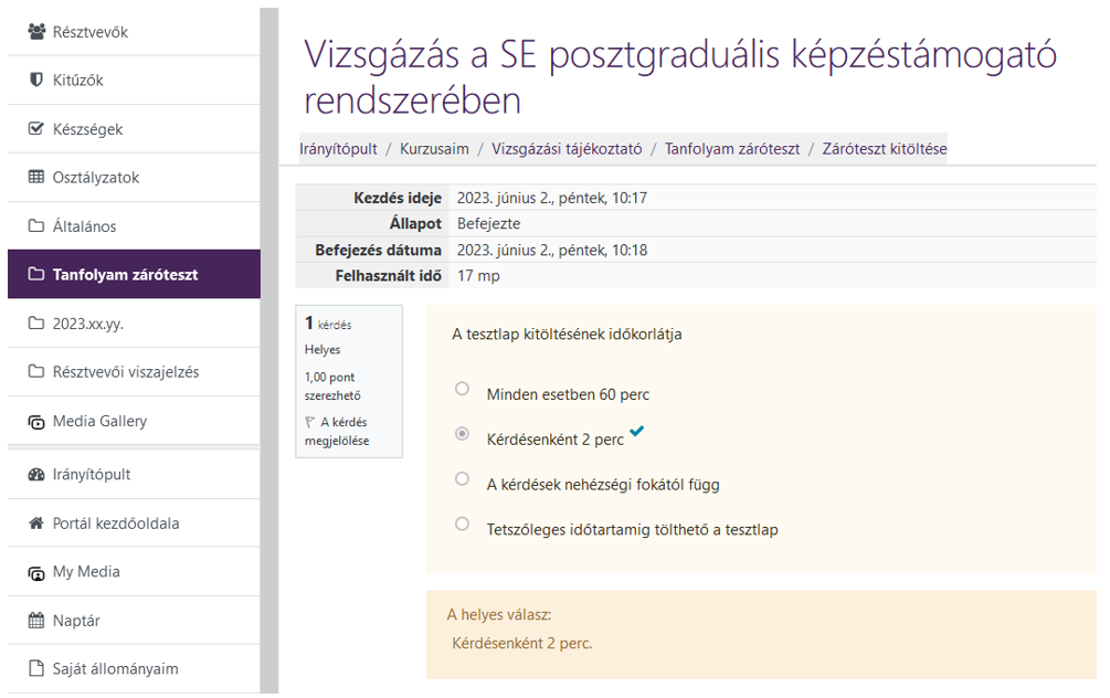 Elektronikus vizsgázás a SE posztgraduális e-learning rendszerében