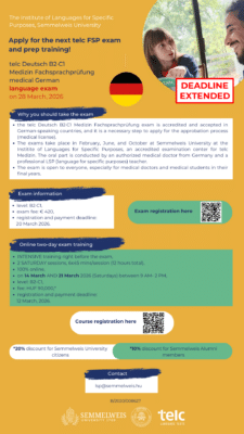 - Discounts: 20% discount for Semmelweis University citizens, 10% discount for Semmelweis Alumni members