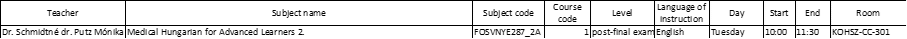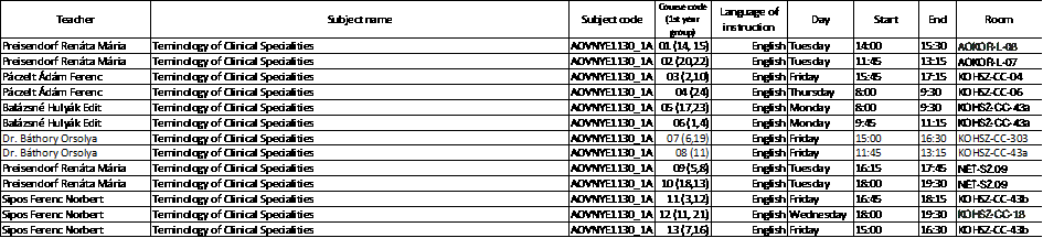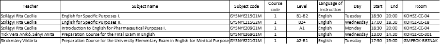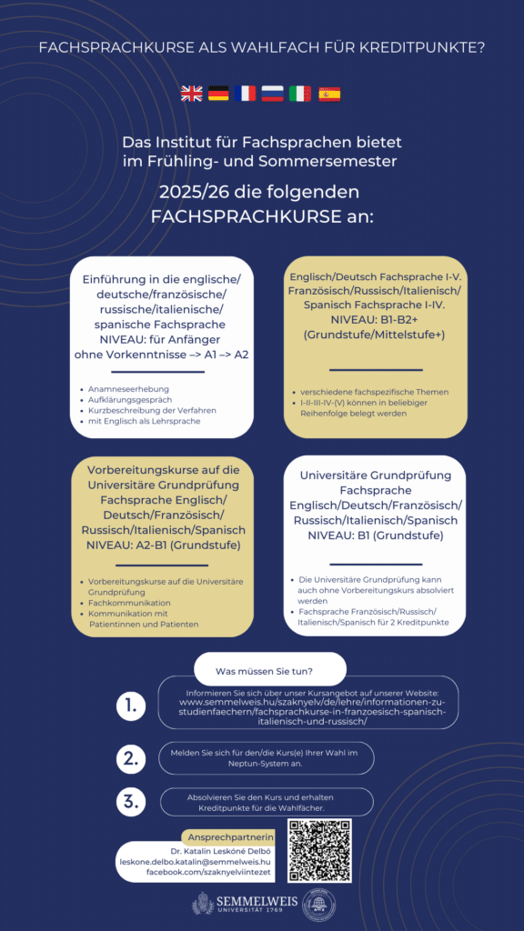 Elective courses for students in English/German programs Medicine Terminology for students in English Medicine (EM) for students in German Medicine (DM) Hungarian English – only for students in the German program German – only for students in the English program French Spanish Italian Russian Dentistry Hungarian English – only for students in the German program German – only for students in the English program French Spanish Italian Russian Pharmaceutical sciences Hungarian not available English – only for students in the German program German – only for students in the English program French Spanish Italian Russian