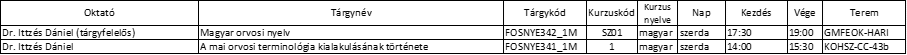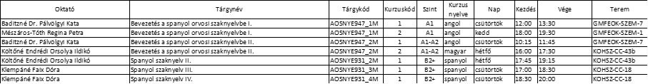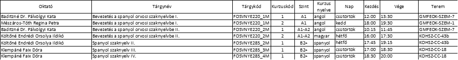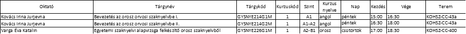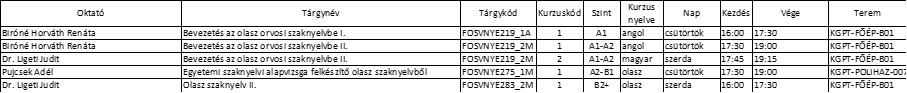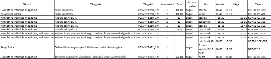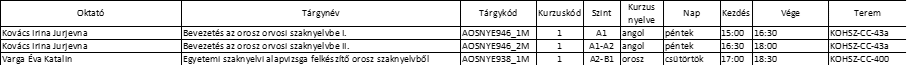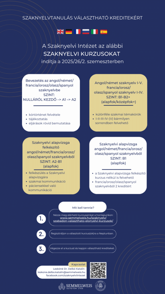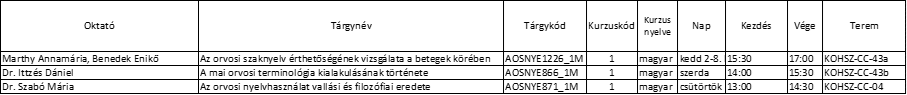 Magyar hallgatók számára felvehető kurzusok ÁOK Terminológia kötelezőként elismertethető választható szabadon választható Angol Német Francia Spanyol Olasz Orosz Orvosi nyelv FOK Terminológia Angol Német Francia Spanyol Olasz Orosz GYTK Terminológia Angol Német Francia Spanyol Olasz Orosz