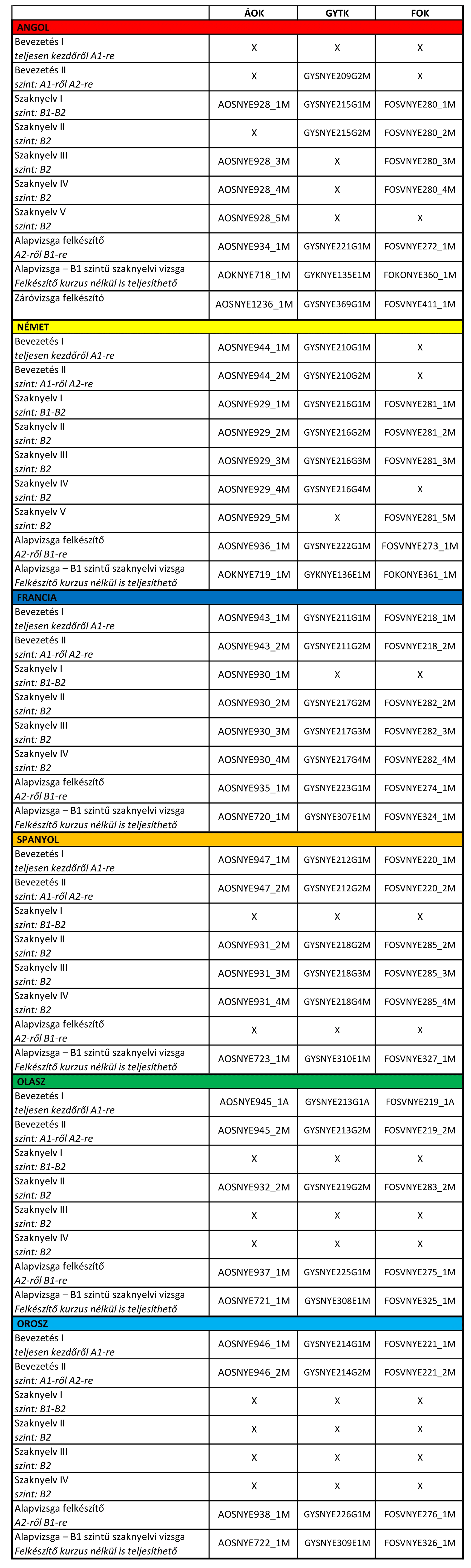 Az egyes tárgyak nyelvi szintjei az általános nyelvtudást jelzik (nem a szaknyelvit), kérjük, olyan kurzust vegyenek fel, amelyik leginkább megfelel a nyelvi szintjüknek az adott nyelvből:
