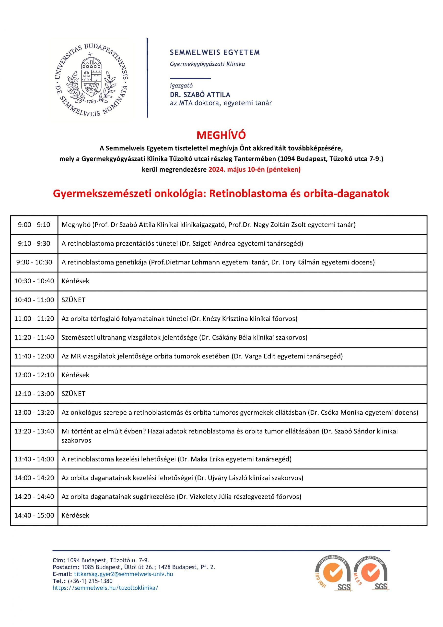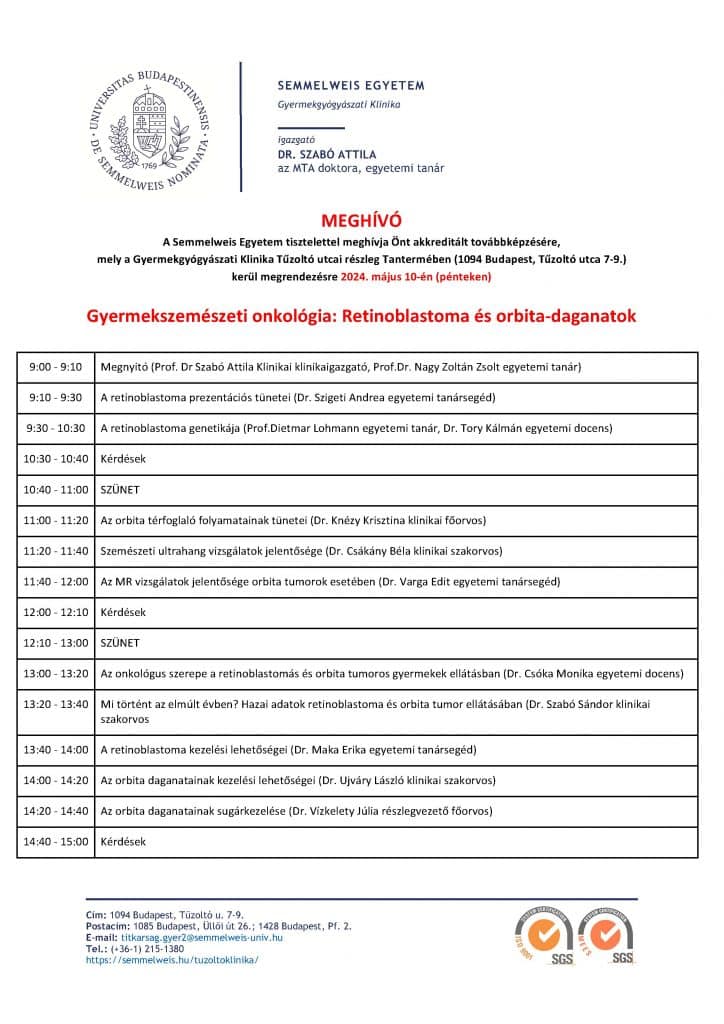 A Semmelweis Egyetem Gyermekgyógyászati és Szemészeti Klinikái által tavasszal elindított Nemzetközi Retinoblastoma Hét folytatásaként, tisztelettel meghívunk minden érdeklődőt a 2024. május 10-én megrendezésre kerülő Gyermekszemészeti onkológia: Retinoblastoma és orbita-daganatok című akkreditált szakmai konferenciára, melyet a Semmelweis Egyetem Gyermekgyógyászati Klinika Tűzoltó utcai részleg Tantermében rendezünk.