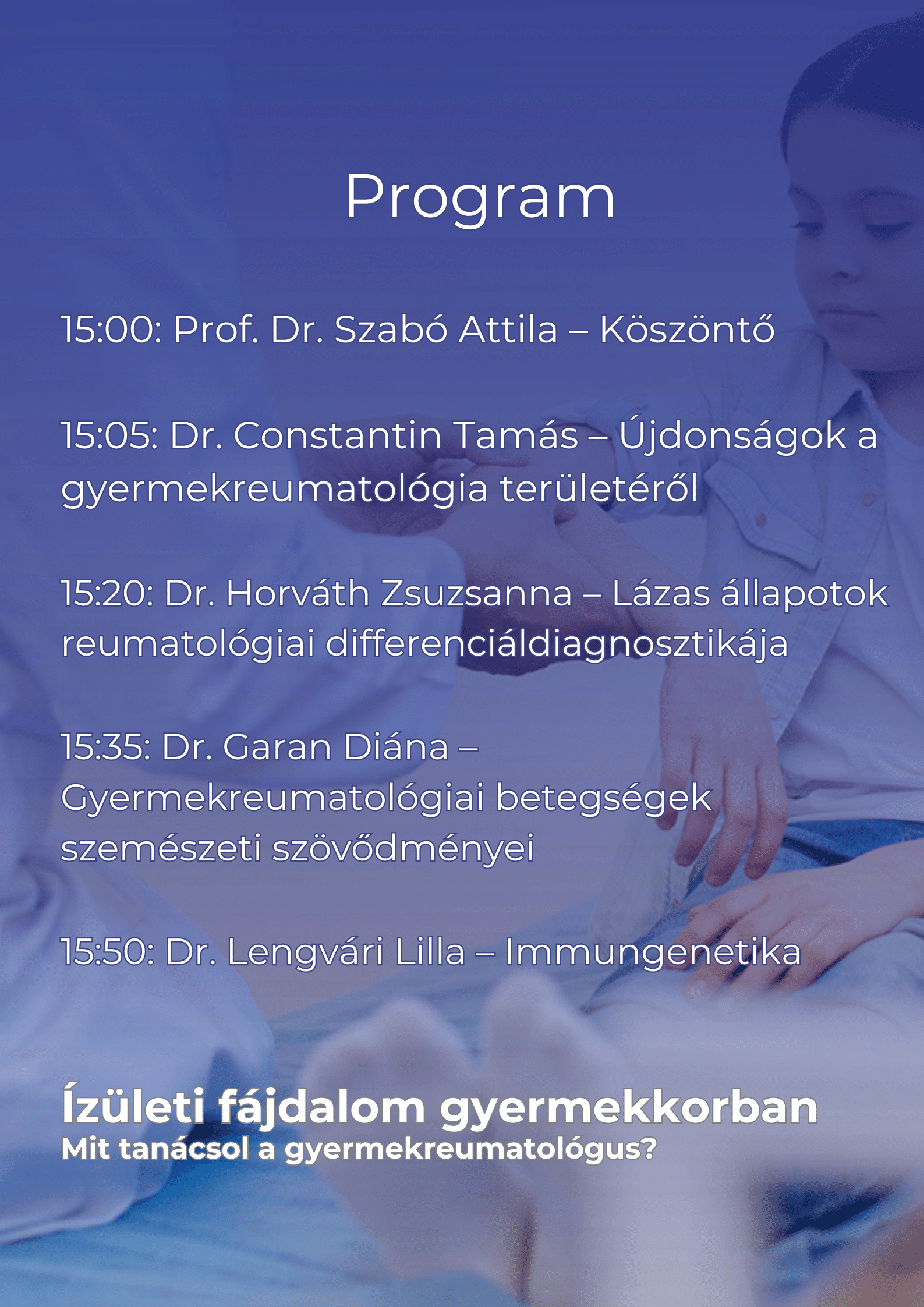 Tévedés azt hinni, hogy csak idősebb korú emberek szenvedhetnek reumatológiai fájdalmaktól. Amíg idősebb korban a fájdalmak tompítása, az életminőség javítása a cél, addig gyermekek esetében a korai felismerésnek köszönhetően megváltozhat a betegség kimenetele, véglegesen megszűnhetnek a panaszok. Mikor forduljunk gyermekreumatológushoz, milyen vizsgálatokra és kezelésekre számítsunk? Szakértőink előadásaikban ilyen és hasonló kérdésekre válaszolnak, valamint bemutatják a legújabb diagnosztikai és terápiás lehetőségeket.