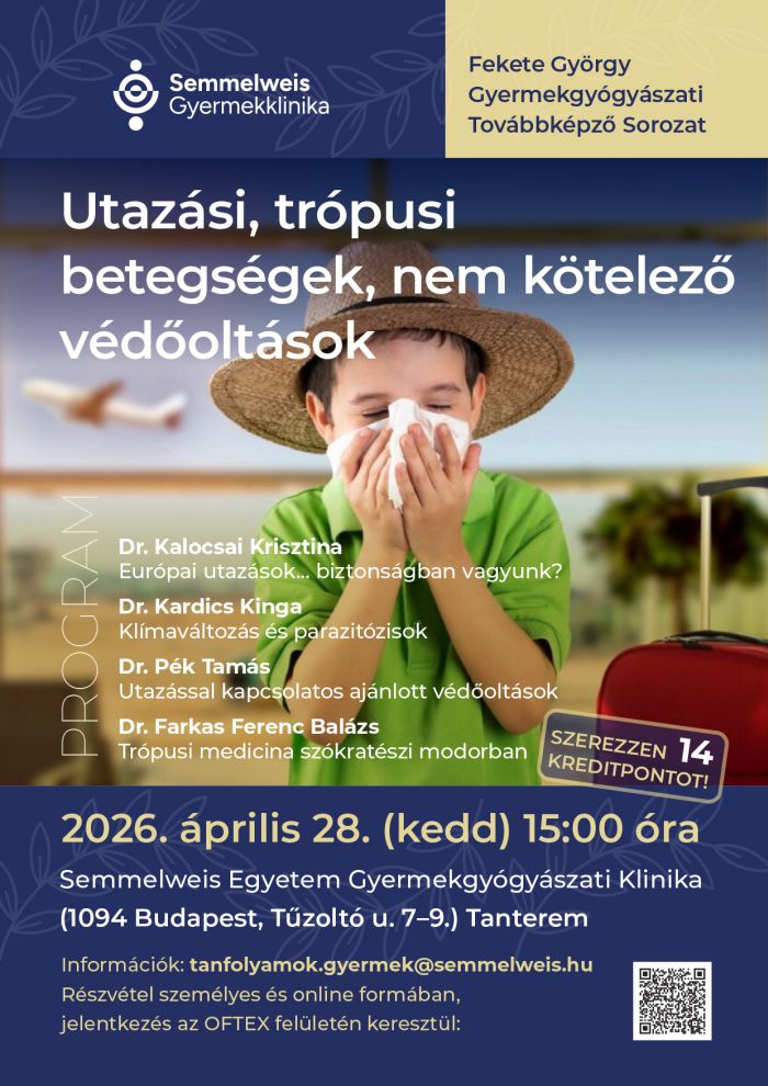 Tanterem", "startDate":"2026-04-28", "endDate":"2026-04-28", "startTime":"15:00", "endTime":"16:00", "location":"Budapest,, Tűzoltó utca 7-9.", "options":["Apple","Google","iCal","Microsoft365", "MicrosoftTeams", "Outlook.com"], "timeZone":"Europe/Budapest", "iCalFileName":"Utazási, trópusi betegségek, nem kötelező védőoltások", "label":"Naptárba"}Tisztelettel várjuk Önöket 2026. április 28-án (kedden) 15:00 órától az alábbi programterv szerint: