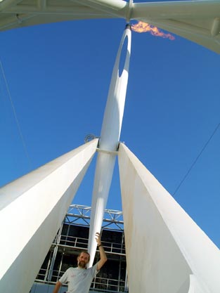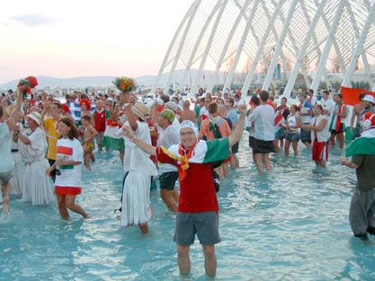 Bal oldalon: Tüzet-lángot viszek ... hogy tovább dobbanjanak a szivek. A „Rogge jutalomcsapat” vezetője, Blazsek József dr. (FOK Orálbiológia) emlékezetes programot hozott össze a láng jegyében, a múlt évi „Tudás Útja” Félmaraton díjazottjai számára. Egyetemünk oroszlánrészt vállal az egyetemi egészségnevelési program országos és nemzetközi szintű megvalósításában, az idén aktuális „EYES” ajánlás kiegészül Rogge Úr nyomán a Nemzetközi Olimpiai Bizotság (IOC) patronálásával is. Így használhatják a versenyhez az IOC logokat! Jobb oldalon: Mámor a vízben...! a megnyert vizipóló döntő után magyar szurkolók a sportkomplexum szökőkútjában hűtötték a forró pillanatok hevét. Előtérben Szkalák Attila a TF Kar hallgatója. (Cikk a 9. oldalon.)