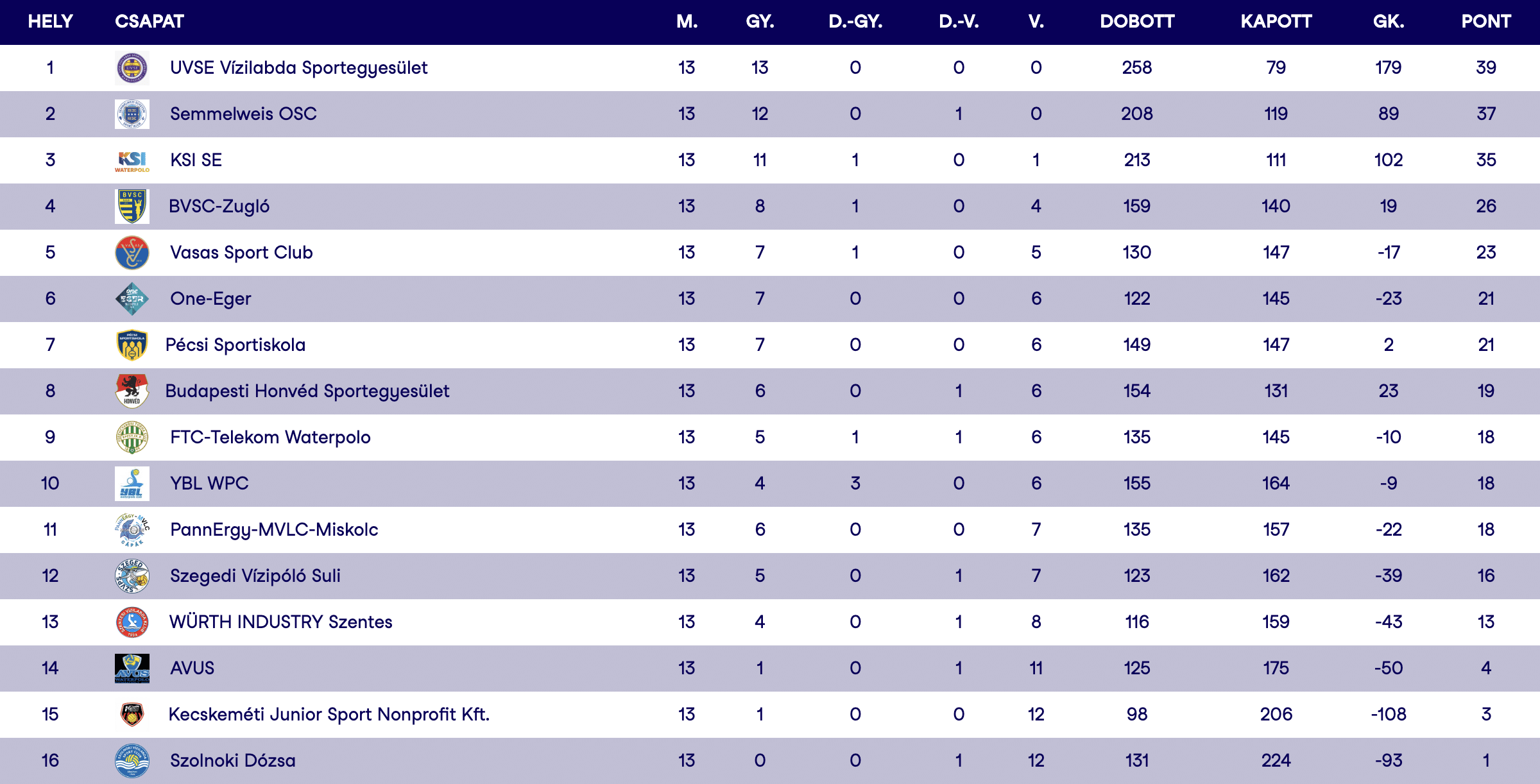 A bajnokság állása a 13. forduló után: